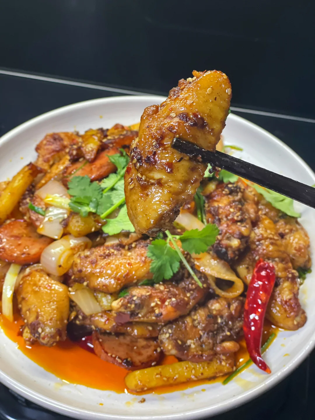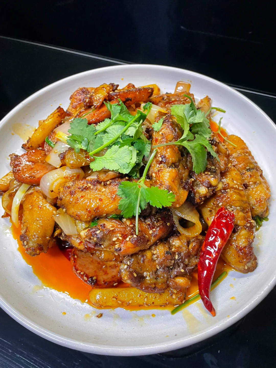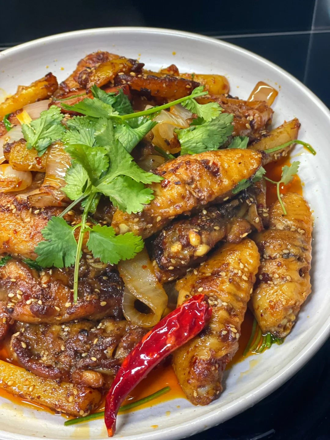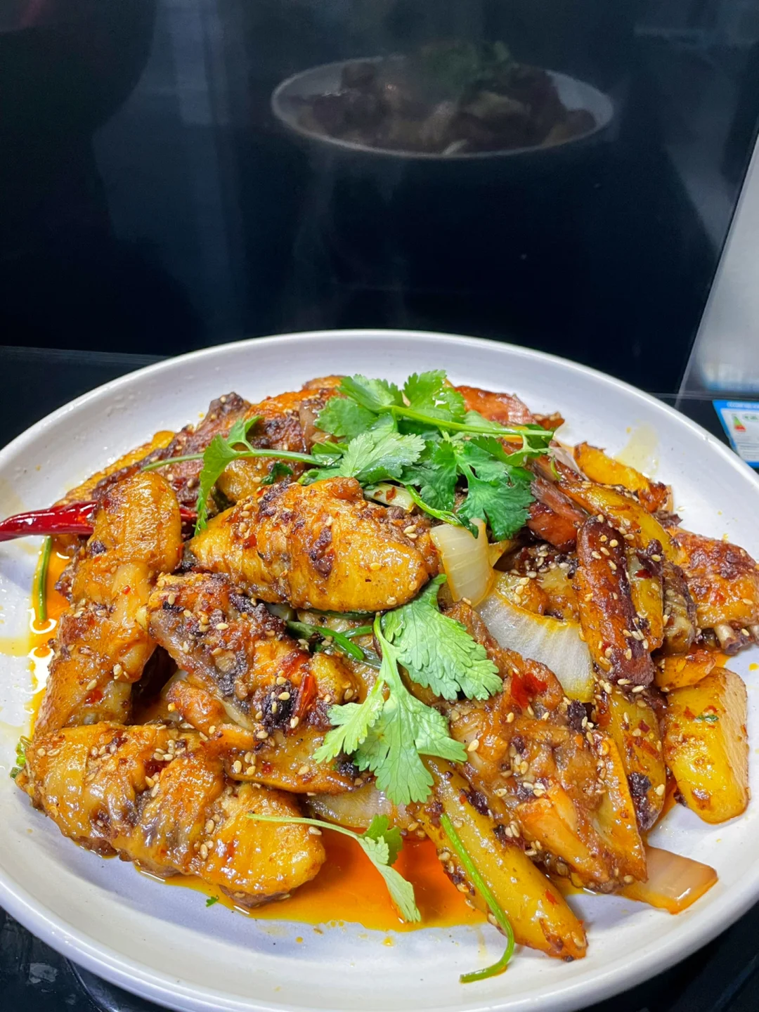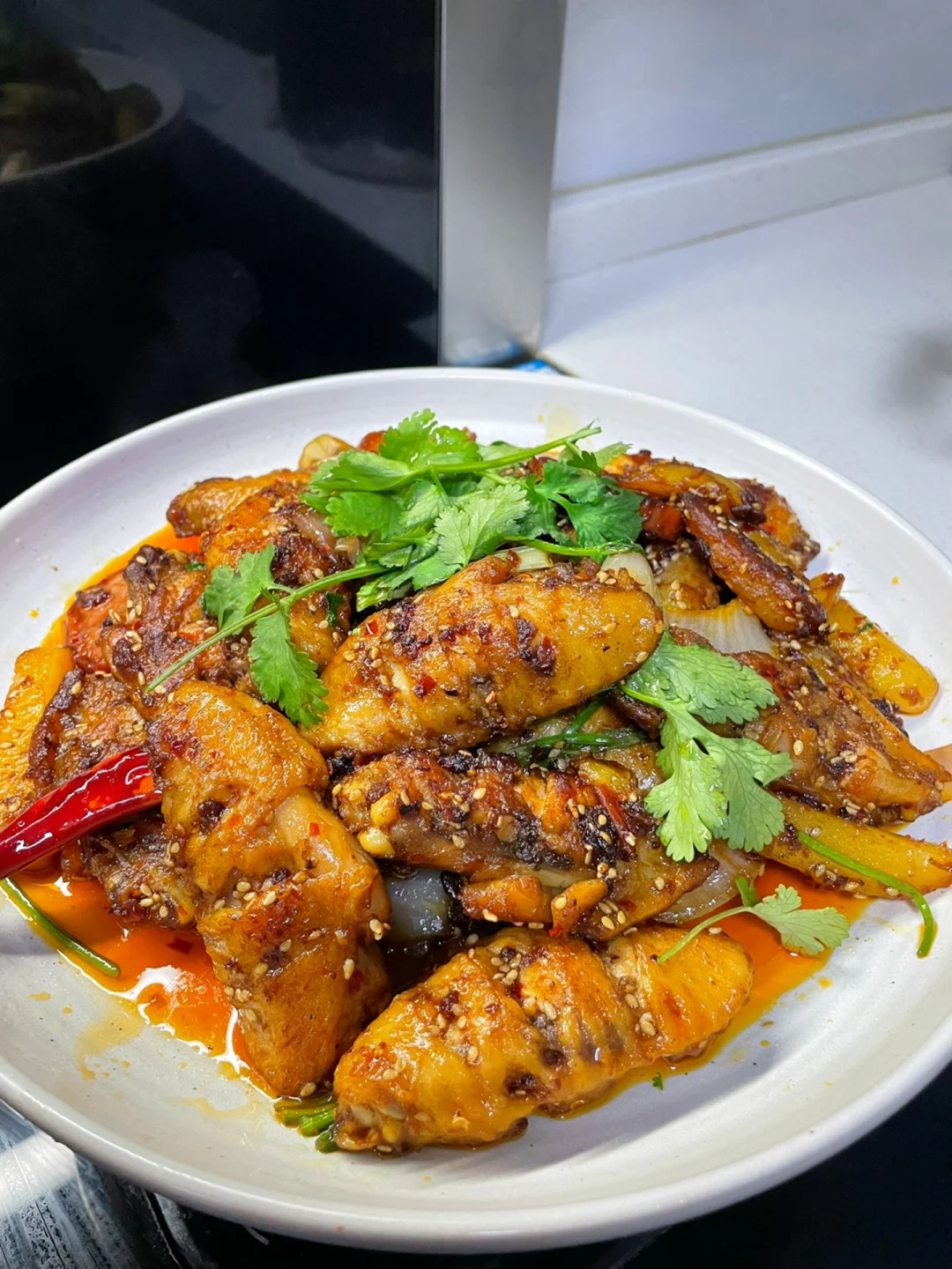 3⃣️:油热放入蒜末,干辣椒,火锅底料和一勺豆瓣酱炒化,倒入鸡翅翻炒入味,再倒入土豆火腿和洋葱翻炒均匀,加入2勺生抽调味,再撒上白芝麻和葱段炒匀,最后撒香菜即可