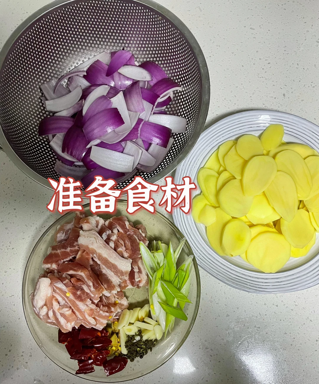 1⃣️:五花肉,土豆,洋葱分别切片备用,配料改刀