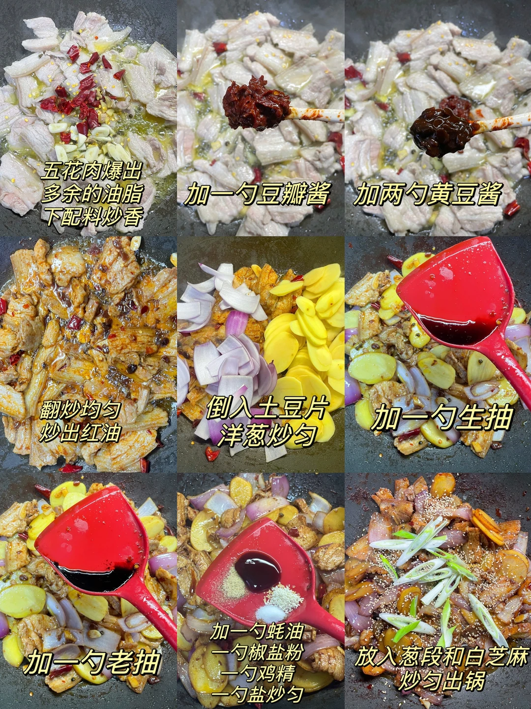 2⃣️:锅中倒入少量油,倒入五花肉炒出多余的油脂,倒入配料炒香,再加入一勺豆瓣酱,两勺黄豆酱炒出红油,倒入土豆片和洋葱翻炒均匀,加入一勺生抽,一勺老抽,一勺盐,一勺鸡精,一勺椒盐粉,一勺蚝油继续翻炒至土豆软烂,五花肉煸炒至微微焦黄的状态,撒入熟白芝麻和葱段炒匀即可