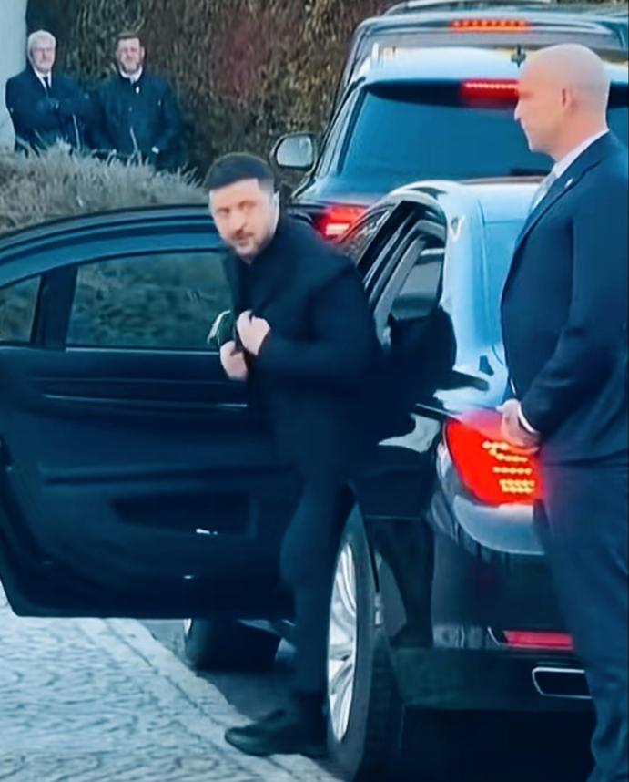泽连斯基还挺有派头不给开车门还不下车,下车了还整理一下衣服。