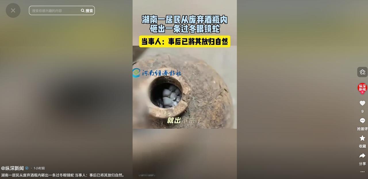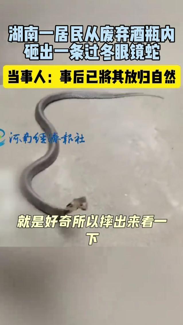 胆子真大!湖南一男子捡到个酒瓶,以为是古董,就踢了一脚!结果,发现瓶子里竟然有动静,他凑近一瞧,吓得直接把瓶子扔了出去,原来,瓶子里居然有一条眼镜蛇,应该是正在冬眠,蛇以为是个洞口就钻了进去,这一摔直接把眼镜蛇摔醒了。男子一把捏住蛇七寸,直接给拎了起来。网友:徒手抓也是个狠人,这要是失误了,全村吃席 那天他路过田埂边的荒草地,眼尖瞥见草丛里躺着个沾了青苔泥垢的青瓷酒瓶,瓶身上还有些歪歪扭扭的花纹,看着不像新物件,换谁瞧见这东西,心里都得咯噔一下,寻思着会不会是哪个年代留下的古董,要是真能换俩钱,那可算捡着漏了。 这位大哥也不例外,心里揣着点小期待,先没急着上手,抬脚轻轻踢了踢瓶身,想先探探这瓶子的底细,正常来说瓷瓶子被踢一下,总得有个清脆的声响,可这瓶子倒好,传来的不是瓷片碰撞的动静,反而是一声闷闷的 “呼” 声,像是里头有什么东西在动弹。 要是换个胆小的,这时候估计扭头就走了,可这位大哥好奇心和胆子一样大,不仅没退还弯腰把瓶子捡了起来,晃了晃又把瓶口凑到耳边去听,里头那窸窸窣窣的声响更明显了,听得人头皮有点发麻。 他还不死心,伸手扯掉了瓶口那团看着像自然堵着的枯草,眯着眼往黑漆漆的瓶口里瞧,除了一股子冲鼻子的土腥味,啥也没看清,可这股子异样的感觉已经让他心里发毛,手一抖直接把瓶子扔了出去。 瓶子 “哐当” 一声砸在旁边的石头上,瓷片瞬间溅了一地,就在这时候,一道黑影 “嗖” 地从碎瓶子里弹了出来,定睛一看居然是一条眼镜蛇!后来才琢磨过来,这瓶子对眼镜蛇来说就是个绝佳的冬眠窝,温度恒定还避光,它估摸着把瓶口当成了能藏身的洞口,就钻进去蛰伏起来,结果这一摔直接把它从冬眠里给震醒了。 刚醒过来的眼镜蛇显然被惹毛了,身子一扭就盘了起来,分叉的信子吐得飞快,那架势看着就瘆人,换旁人这时候早撒腿跑了,可这位大哥的操作直接让人看傻了眼,就在蛇头刚抬起来的瞬间,他压根没犹豫,也没往后退半步大手一伸,居然精准地捏住了蛇的七寸,直接把这条眼镜蛇给拎了起来,那动作快得让人都没反应过来,蛇在他手里瞬间就没了之前的凶劲。 这事后来传到网上,网友们都炸开了锅,有人说这大哥是真狠人,徒手抓眼镜蛇可不是一般人敢干的,还有人想起了柳宗元的《捕蛇者说》,调侃永州这地方的人,怕是捕蛇本事都刻进 DNA 里了,更多人则是替他捏了把汗,直言这要是稍微失误一下,那后果不堪设想,指不定就得全村吃席了。 可大伙不知道的是,这事儿其实满是侥幸,冬眠期的眼镜蛇,心脏跳动频率早就降了下来,代谢慢得很,身子也僵硬,神经反应比平时迟钝不少,毒性也只有旺季的七成。要是换在夏天,这眼镜蛇的反应速度根本不会给他伸手的机会,估计蛇头一扭毒牙就咬进手腕了。 哪怕是冬天,这毒液的威力也不容小觑,真要是被咬到,毒液顺着血液扩散开,几分钟内就能让人出现不可逆的危险,那可就真的是拿命赌了。 这位大哥能一下子制住毒蛇,要么是从小在山里长大练出的肌肉记忆,要么就是被吓懵后的应激反应,可这操作压根没法复制,咱平时在野外,不管是路边的瓶瓶罐罐,还是石缝树洞,看着平平无奇,里头可能就藏着这样的危机。 真要是在野外撞见这种不速之客,可别学这位大哥的操作,也别信什么 “祖传本事”,命就一条,最稳妥的法子就是慢慢往后直线退,毕竟蛇根本追不上直线后退的人。 说到底,这位大哥是真的胆子大,可这更多是运气好,千万别把这种侥幸当成自己的本事,更别拿着性命去赌野外的物件里装的是惊喜还是惊吓,毕竟平安才是最要紧的。 (信息来源:纵深新闻)