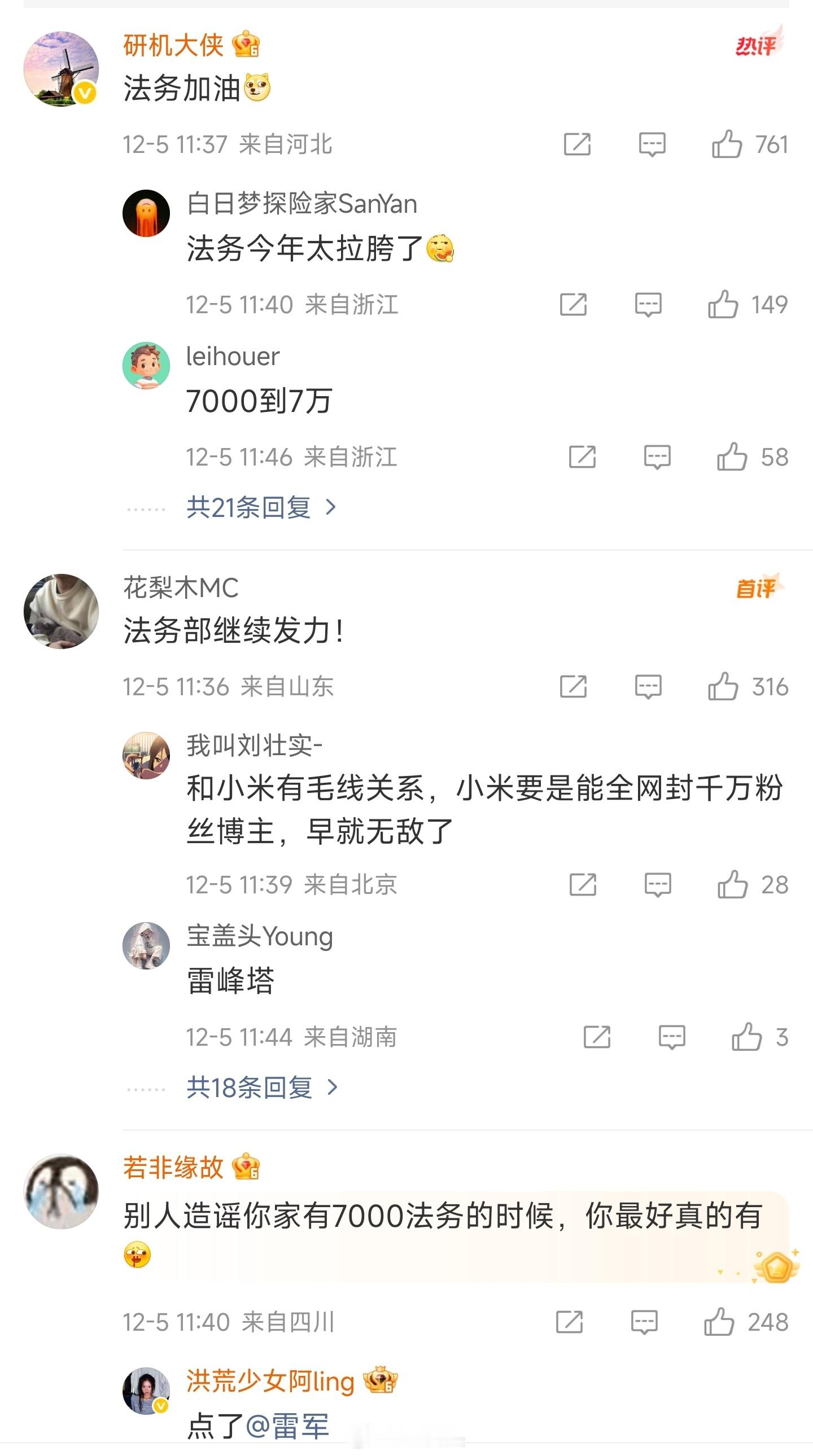 雷军请网友提意见 雷军请网友提意见,广大网友建议法务加油,法务发力。我也觉得小米应该让法务发力,别说这千万粉的动不了,就dy那群起号的老登小米也拿他们没办法。陈震是被法办的,是因为偷税漏税,11月开始查的,然后11月他引战对立太明显了。有些时候,有些事能别蹭就别蹭,别引火烧身,你只是一个网红,不是天王老子。。。