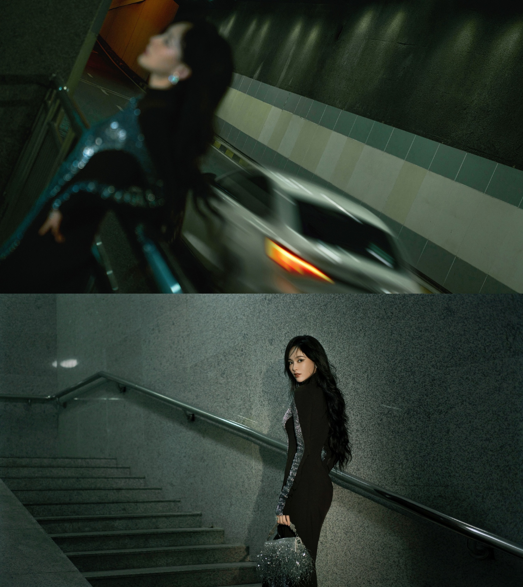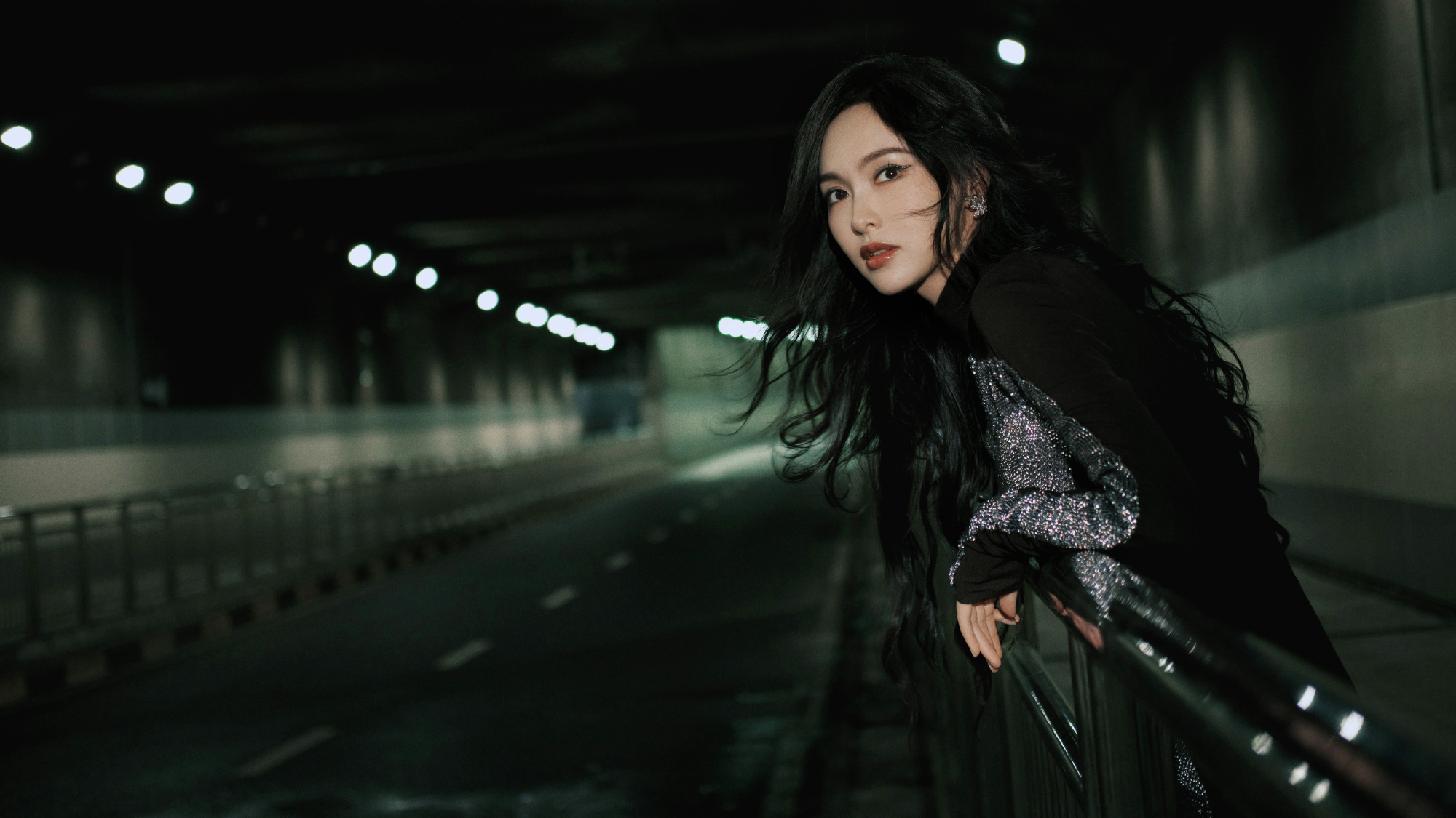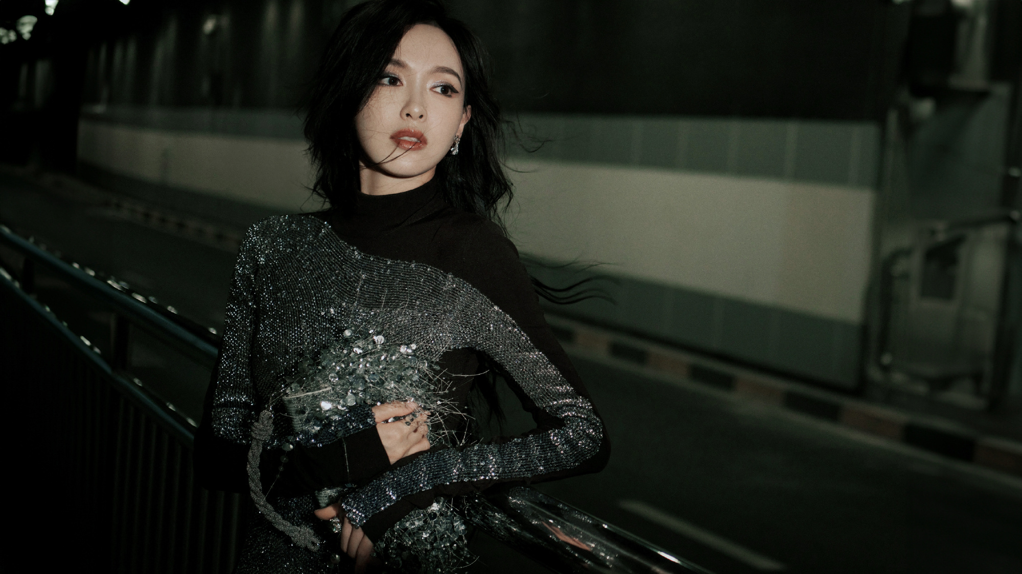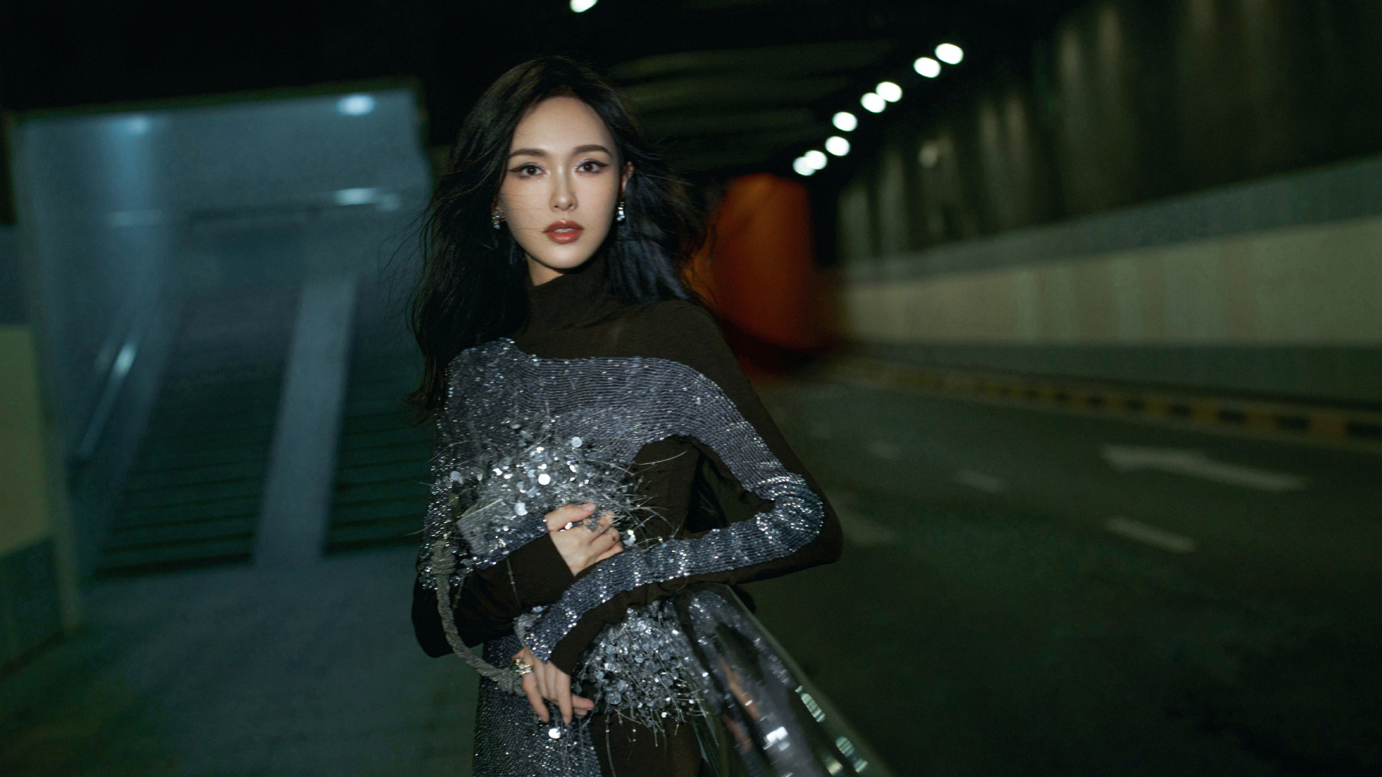 唐嫣,卷发红唇黑衣妆造,街角的浪漫。唐嫣状态