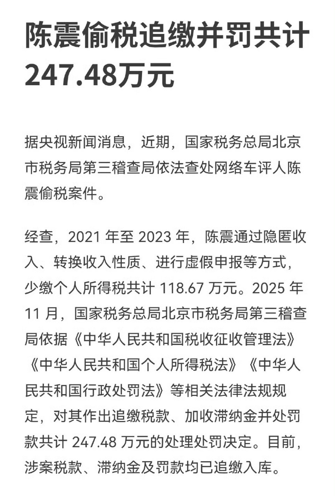 陈震偷税案真的成了回旋镖!原以为就是太飘了说错话了,封几天就出来了!一条视频报价80万的头部博主,现在号封了、全网都知道了,品牌也开始删合作视频了,以后想再吃这碗饭也难了…陈震偷税追缴并罚共计247.48万元