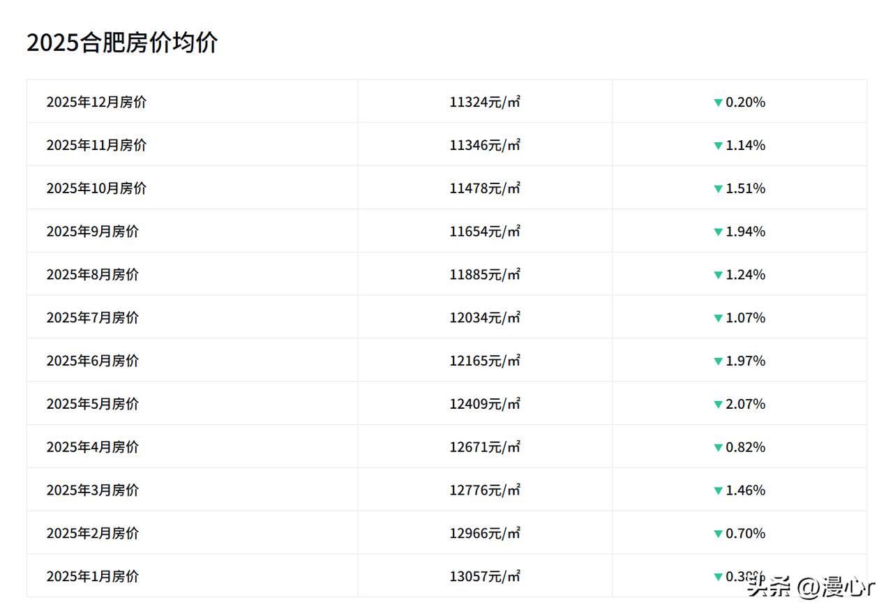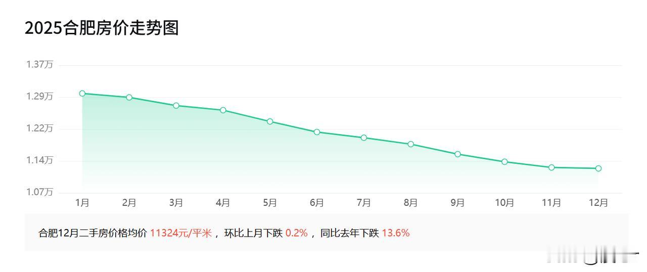 2025年1月,合肥二手房房价均价13057元; 2025年2月,合肥二手房房价均价12966元; 2025年3月,合肥二手房房价均价12776元; 2025年4月,合肥二手房房价均价12671元; 2025年5月,合肥二手房房价均价12409元; 2025年6月,合肥二手房房价均价12165元; 2025年7月,合肥二手房房价均价12034元; 2025年8月,合肥二手房房价均价11885元; 2025年9月,合肥二手房房价均价11654元; 2025年10月,合肥二手房房价均价11478元; 2025年11月,合肥二手房房价均价11364元。 2025年1-11月合肥的二手房价,累计下调了约13%。有机构数据显示,合肥二手房月均成交量在4700套左右,但月均新增挂牌量超过8000套,卖房的人远比买房的人多。 其实,2025年合肥的房价呈现冰火两重天,一边是追求住得更好的改善型需求,撑起了新房市场;另一边,是大量以价换量的二手房,特别是老破小。二手房市场里,成交主力是房龄10-15年甚至更老的房子。当市面上充斥着设计过时、物业一般的老旧房源时,它们唯一的竞争力就是价格。 伴随着房住不炒的政策深入人心,合肥的经济发展和人口结构,才是最终决定这座城市房价的根本。
