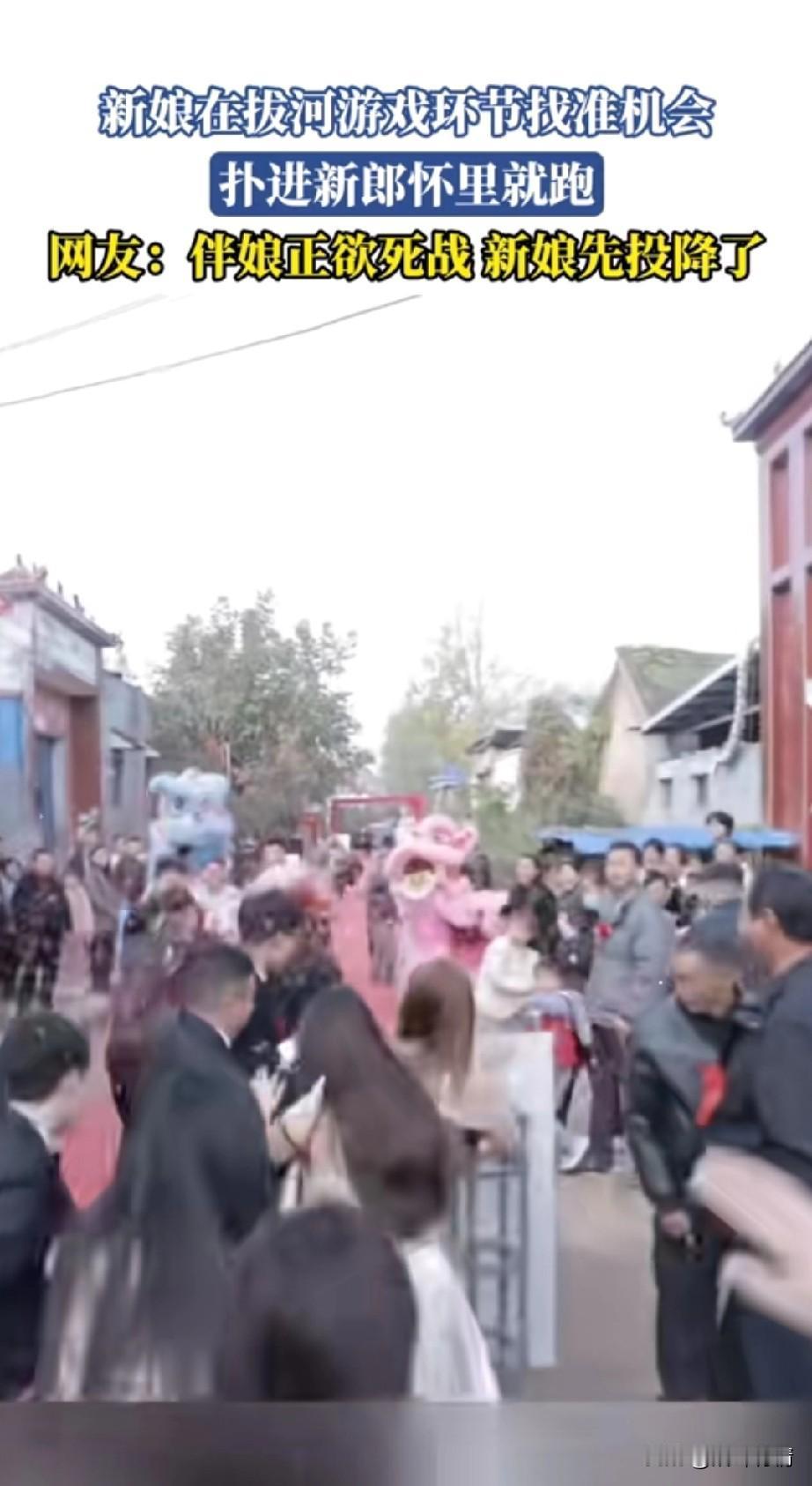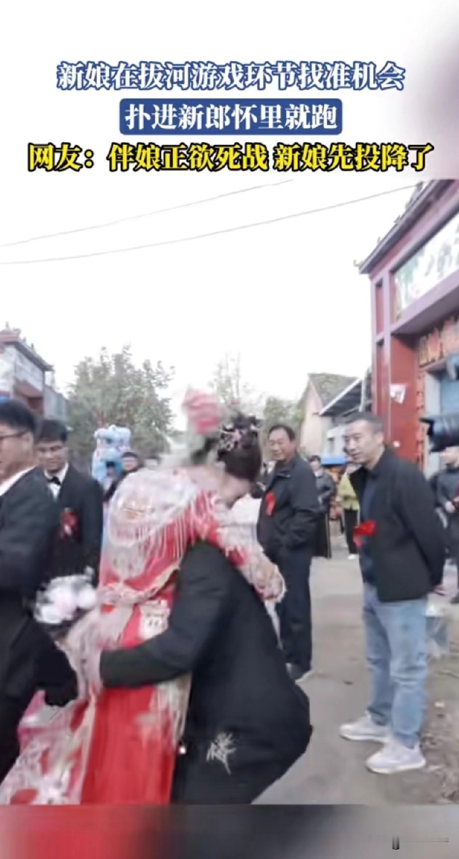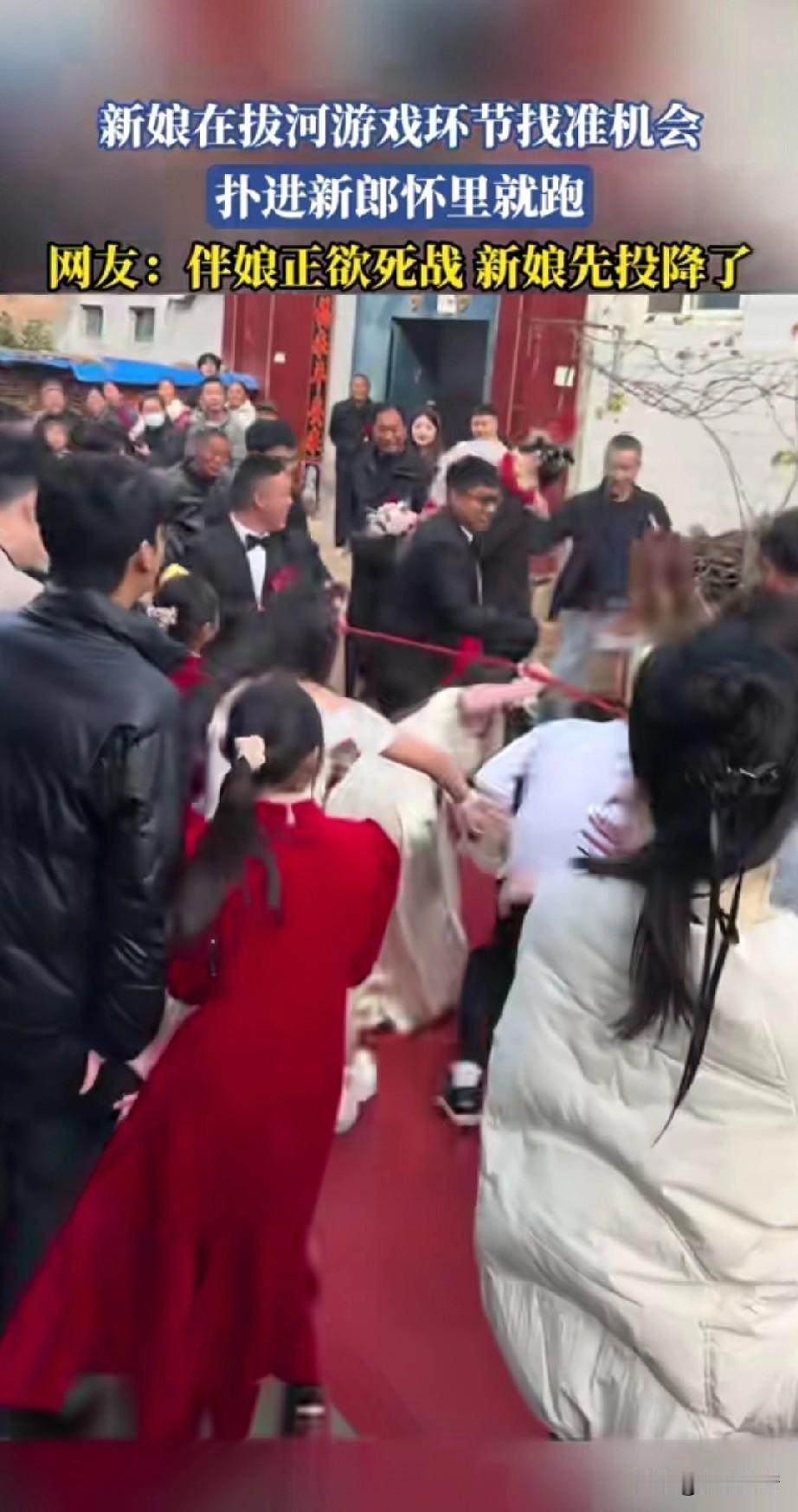 河南这婚礼真有意思, 游戏居然是拔河比赛, 新娘和新郎以及伴郎拔河, 拔河赢了才能娶新娘, 正当伴娘全力以赴的时候, 新娘瞅准时机扑到了新郎的怀里, 这可谓是釜底抽薪, 出来新娘想早点嫁, 居然抛下了伴娘团, 新郎扛着新娘就跑了, 后面的伴娘追了一路, 周围的人都被这一幕笑坏了, 毕竟这么逗的婚礼还是头一次见, 婚礼上的小游戏总是这么让人意外, 拔河还是第一次见, 难怪网友表示伴娘欲要死战, 奈何新娘先降! 大家对于这样的婚礼游戏怎么看? 河南新郎婚礼 河南新郎婚礼 河南式婚礼 河南人婚礼 热血拔河名场面 结婚婚礼游戏