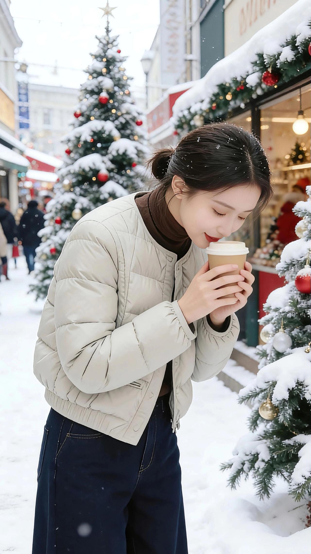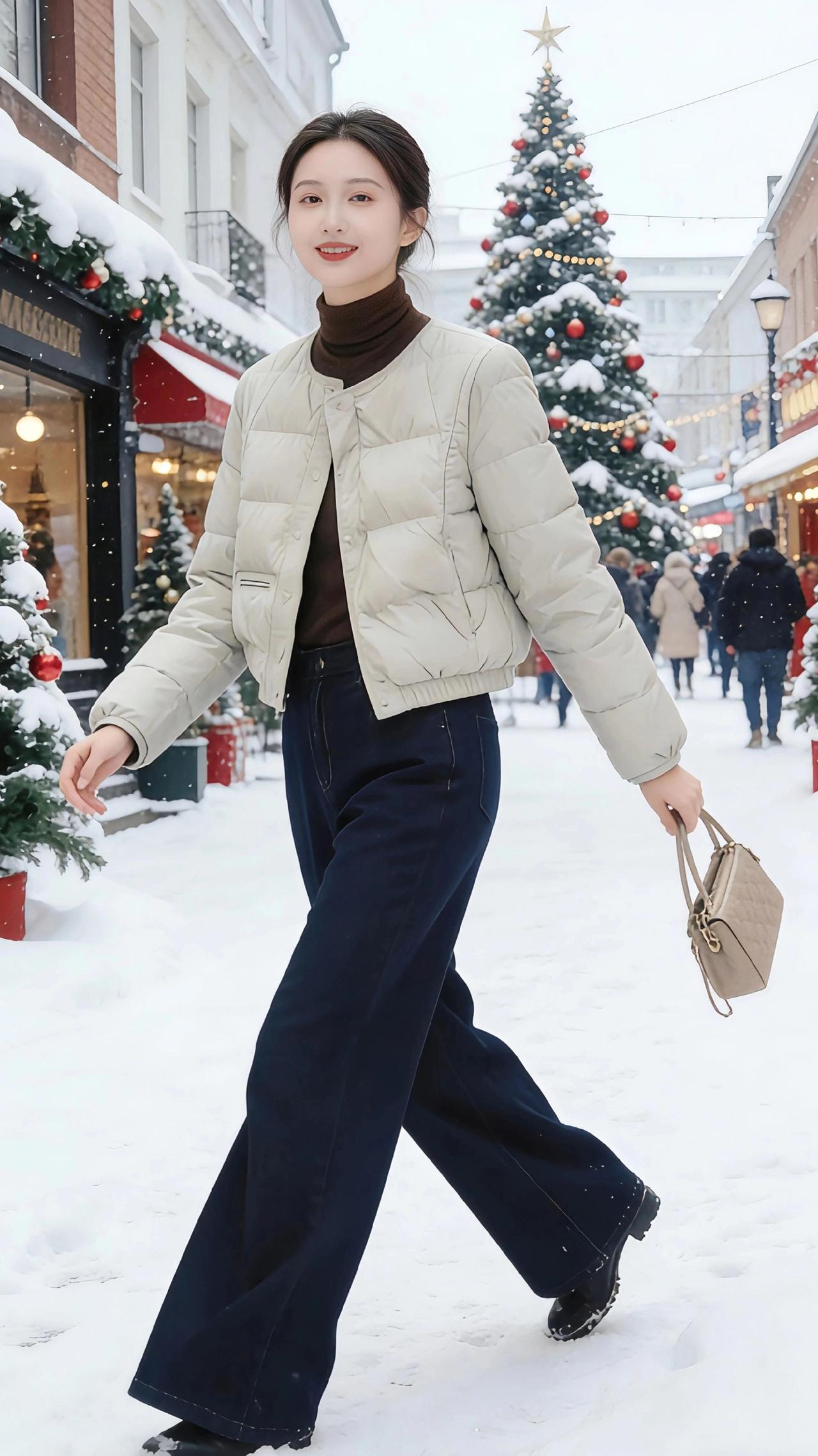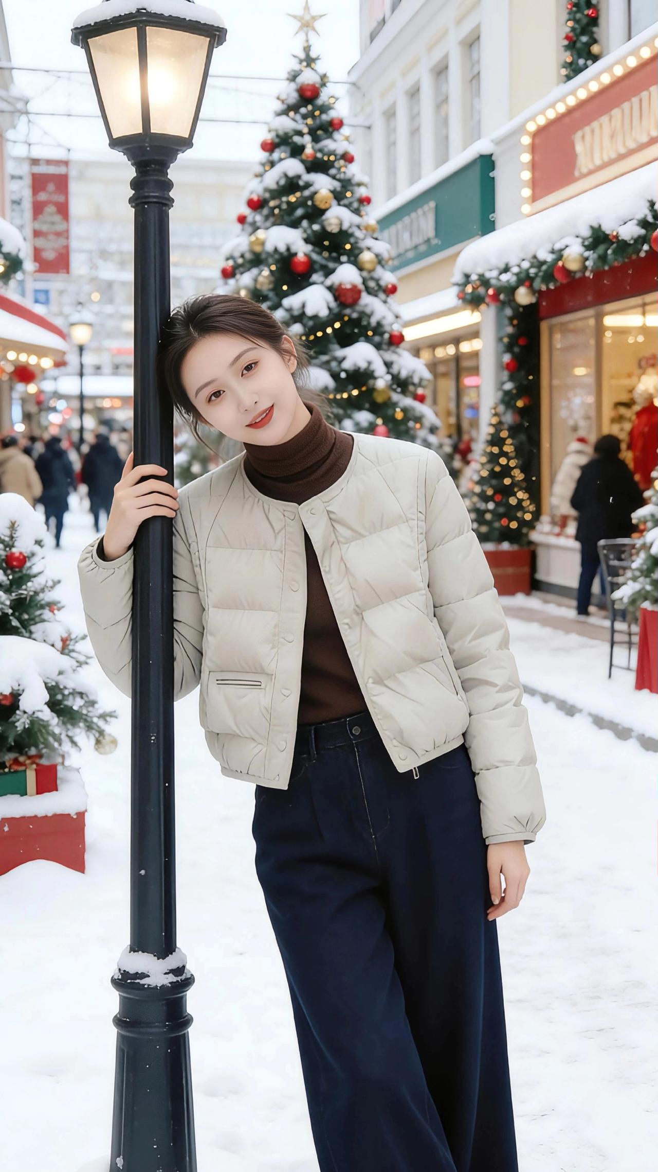 雪落进冬的褶皱里时,她正站在路灯与圣诞树之间。米白棉服裹着绒绒的暖,像把整季的月光揉作了衣料,连落雪都肯在肩颈处多作停留。 街衢是热闹的——橱窗里的灯串漏出碎金,行人裹着厚衣踩碎薄雪,圣诞球的红在松枝间跳荡,像冬夜不肯睡去的星。可她偏是静的:拢围巾时指尖蹭过流苏,捧热饮时呼吸漫成白雾,回头掠发的瞬间,雪粒子沾在发梢,成了发间藏着的碎钻。 她倚着灯柱望街景,影子被雪光浸得软和。风裹着糖霜味掠过,棉服的褶皱里落满了冬的轻响——是雪吻过衣料的细声,是热饮暖透掌心的微温,是她眼底盛着的、比街灯更软的光。 这冬夜原是热闹的,可她往那里一站,便成了寂静里最温柔的一笔。要不要我再帮你把这段散文扩写成更细腻的短篇?高级感穿搭 小个子穿搭 穿搭 冬季穿搭
