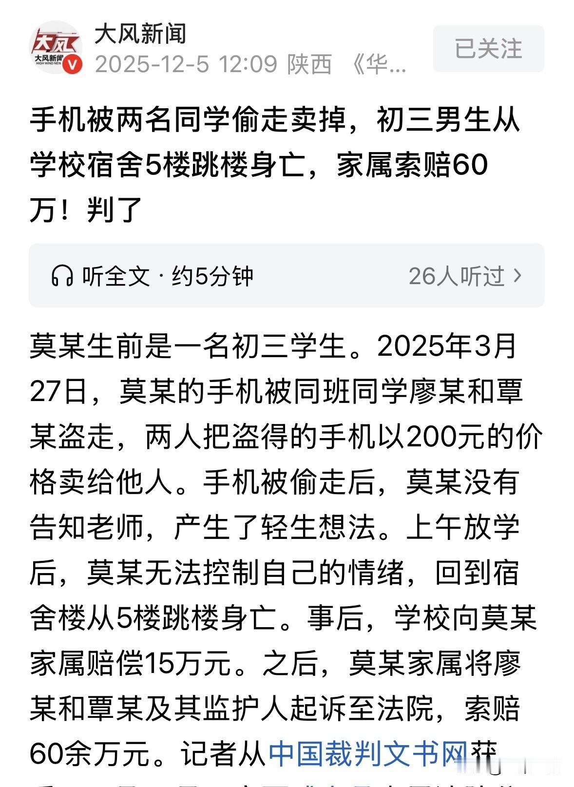 广西来宾,2名初三男生趁教室没人,偷拿走一男同学藏在课桌里的手机,因学校禁止带手机,他们断定同学不敢声张,随后,2人请假来到校外,200块把手机卖了,并拿着卖来的钱美滋滋喝起了奶茶,没想到,另一边同学发现手机不见后,怕被家长和老师责备,竟选择从宿舍楼5层一跃而下,轻生了。同学家属拿到校方15万赔偿后,又把涉事2名男孩及其监护人诉至法院,索赔60万,法院判了! 2025年3月27号,上午大课间活动时,初三学生莫某所在班级的同学陆续前往操场做操。 然而,廖某、覃某等四人却偷偷溜回教室逗留。 廖某眼尖,一下就瞅见莫某课桌里露出一角的手机,那是莫某偷偷带进学校的。 学校三令五申禁止学生携带手机,廖某和覃某交换了个眼神,凑一块嘀咕,说反正莫某不敢声张,咱俩把手机拿走他也不敢告诉老师。 两人一合计,当即决定把手机偷走换钱花。 第三节课刚下课,廖某和覃某就找了个借口向班主任请假,谎称家里有事要提前离校。 两人揣着偷来的手机直奔校外,以200元价格卖给了手机店老板,各自分得100元后,又美滋滋地去奶茶店买了杯珍珠奶茶,像没事人一样喝着奶茶溜达。 另一头,莫某做完课间操回到教室,一摸抽屉就发现手机不见了。 他瞬间慌了,这手机是父母省吃俭用给他买的,要是丢了,回家肯定得挨顿狠批。 可更让他害怕的是,学校禁止带手机,要是被老师知道,说不定还要挨处分。 莫某确实像廖某二人预想的那样,明明急得头顶冒烟了,却硬是没敢声张。他悄悄翻找了几遍抽屉,又问了问同桌有没有看到,但始终不敢告诉老师。 因为手机的事,莫某变得六神无主,他上课开始走神,老师讲的知识点一句也没听进去。 中午放学时,他一个人晃晃悠悠往宿舍走,越想越绝望。手机没了,回家怎么交代?老师知道了会不会骂他? 这种念头在他脑子里打转,让他情绪越来越不稳定,最后竟萌生了轻生的想法。 当天中午12点左右,莫某独自回到宿舍楼,踩着楼梯一步步爬上五楼。 他站在栏杆边往下看,头晕得厉害,心里却有个声音在喊:跳下去就解脱了! 他没犹豫多久,就翻过栏杆跳了下去。 宿舍管理员发现后吓得魂都没了,赶紧拨打了120和110。莫某被紧急送往医院抢救,可下午2点20分,医生还是宣布抢救无效死亡。 这个年仅15岁的少年,就这样永远闭上了眼睛。 事发后,廖某和覃某听说莫某跳楼了,吓得魂不附体。两人赶紧凑钱把手机赎了回来,主动跑到公安局自首。 公安局调查后,以盗窃为由对他们处以行政拘留10天,但因为两人未满16周岁,最终还是没有执行拘留。 莫某的家人悲痛欲绝,把廖某、覃某和学校都告上了法庭,索赔60多万。 《民法典》第1188条规定:无民事行为能力人、限制民事行为能力人造成他人损害的,由监护人承担侵权责任。 廖某、覃某均为未满16周岁的限制民事行为能力人,其盗窃手机并导致莫某跳楼身亡的行为,适用于这个法条。 结合《民法典》第1165条“行为人因过错侵害他人民事权益造成损害的,应当承担侵权责任”,廖某、覃某的盗窃行为与莫某的死亡存在直接因果关系,两人偷手机引发莫某心理危机,最终导致跳楼。 如果监护人能证明已充分履行监护职责,可减轻责任。但是,廖某、覃某的监护人未及时发现并纠正其盗窃行为,故不适用减轻条款。 学校虽因管理疏漏承担过责任,但已通过赔偿协议履行完毕。监护人需为孩子的具体侵权行为买单,而学校则需为管理缺位担责,两者并行不悖。 法院审理时发现,学校虽然事后和家属达成了15万元的赔偿协议,但在日常管理中确实存在疏漏。 学校在大课间活动时没发现学生滞留教室,也没及时排查学生携带手机的情况。不过既然已经赔偿,法院就不再追究学校责任。 法庭上,法官重点分析了各方责任。 莫某作为15岁的少年,遇到事情没能正确处理,选择跳楼轻生,自己要承担主要责任。 廖某和覃某偷手机的行为虽然不直接导致死亡,但客观上引发了莫某的心理危机,和跳楼有因果关系,所以得担20%的责任。 而两人作为限制民事行为能力人,他们的监护人也得跟着赔钱。 最终法院算出总损失875144元,廖某、覃某及其监护人连带赔偿20%,即175028.8元,再加上1万元精神抚慰金,总共赔185028.8元。 这件事,真是让人心里不是滋味。莫某才15岁,就因为手机被偷,情绪崩溃跳楼,太可惜了。 如果他遇到事后鼓起勇气找老师、家长帮忙,而不是自己憋着,最后也不会走上绝路。 再说这廖某、覃某,俩人年纪小不懂事,那么这个责任就落在了父母头上,毕竟孩子犯错家长有责任管教。 所以说,父母对孩子的教育至关重要,否则可能就落得个害人害己的地步。 对于这件事,你怎么看? 欢迎关注@一案一论