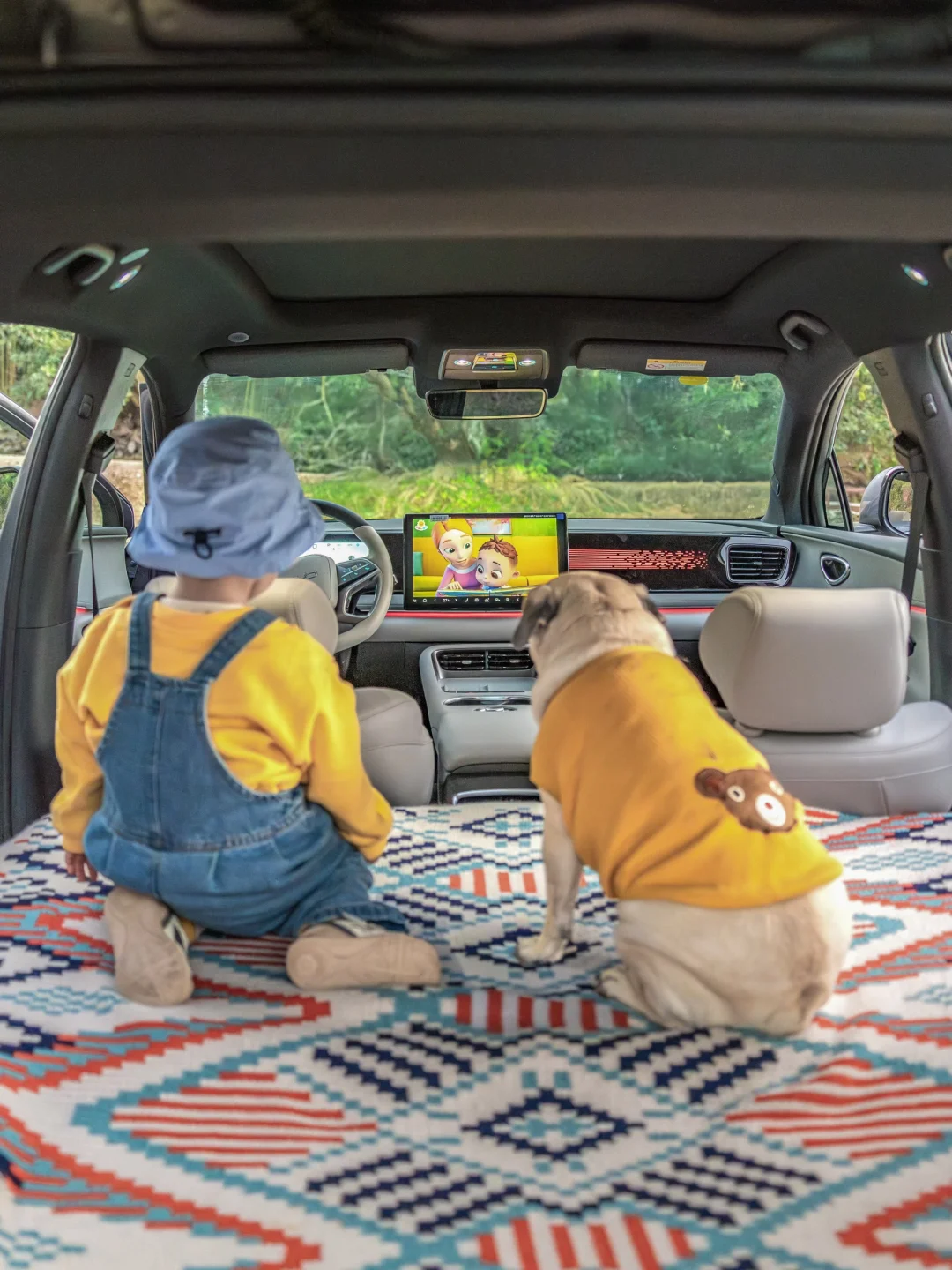 而且真的超能装!娃和狗狗的东西,还有露营装备都能全部装下,后排放倒秒变1630L大空间,铺上毛毯就是一张“大床”,娃和狗狗能在上面睡觉撒欢儿~