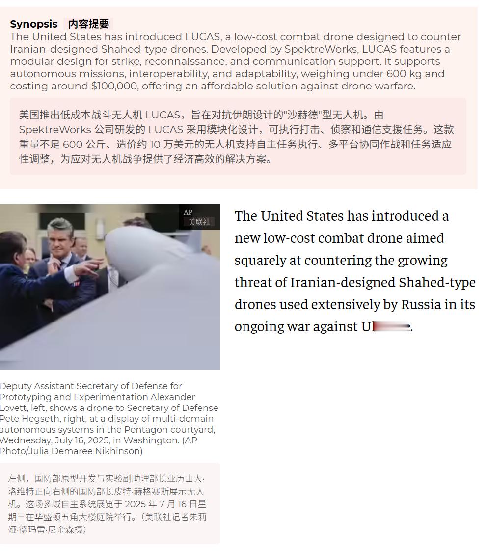 🔻美国媒体称:美国中央司令部“蝎击”特遣部队已在中东部署 LUCAS(低成本无人作战攻击系统)制导打击无人机,配备星链终端。🔻就是仿制的伊朗小摩托。由亚利桑那州 SpectreWorks 公司研制。🔻图1是2025 年 7 月 16 日星期三在华盛顿五角大楼庭院观看展示的美国战争部长赫格赛斯,面色比较凝重。🔻不知道是不是因为得知“造价约 10 万美元”(图3)🔻10万刀!真刺激。热点现场海外新鲜事