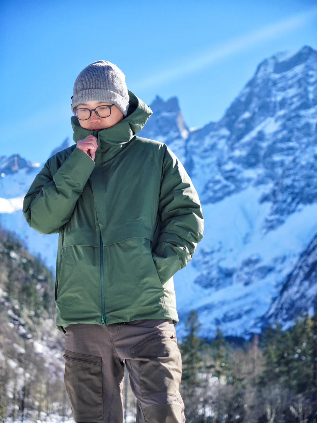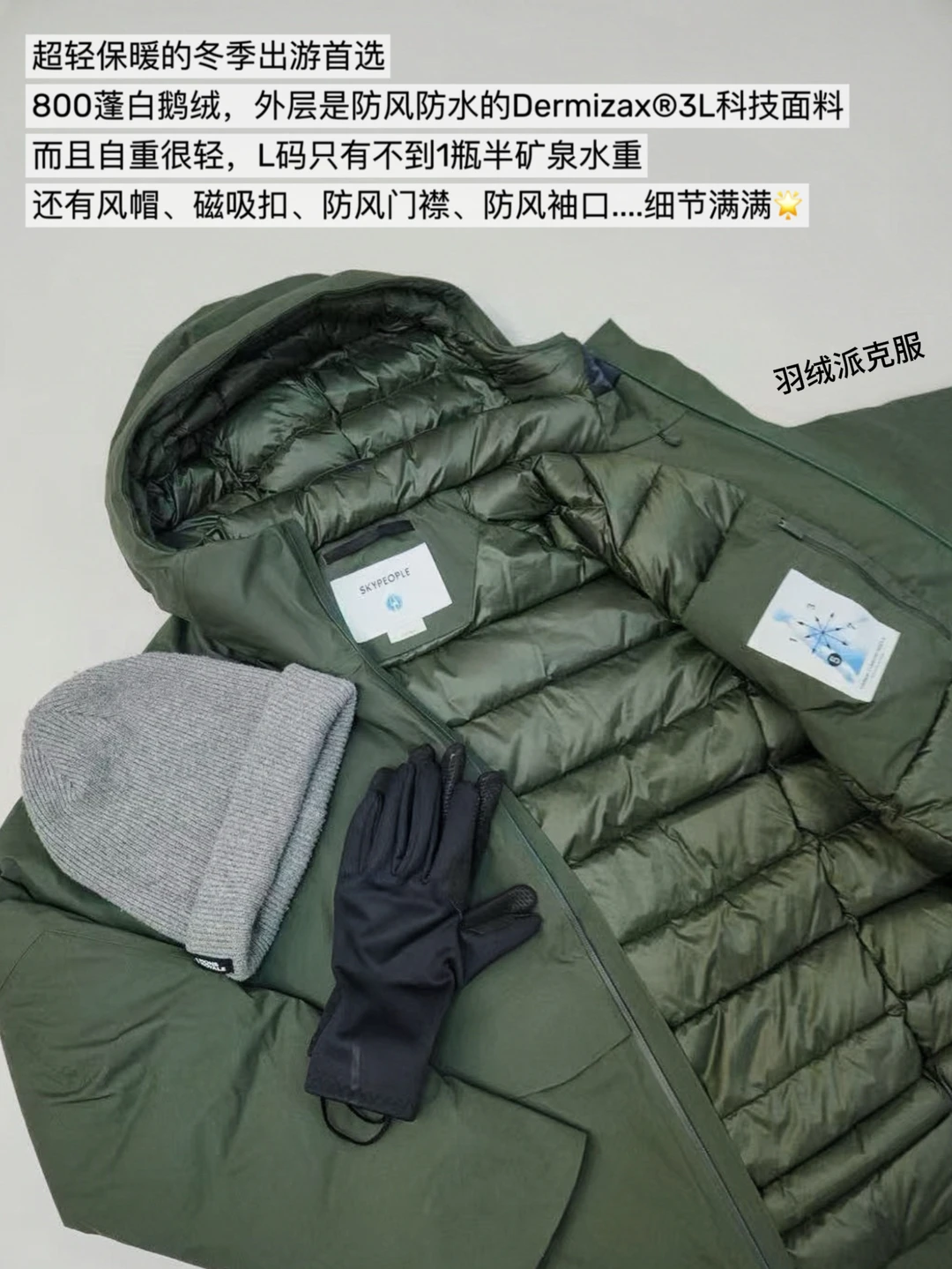 户外防寒级别的800蓬白鹅绒➕箱式充绒,能穿到-15°。外层面料是整衣压胶,防风防雨也耐污,遇到雨雪天气也不怕。