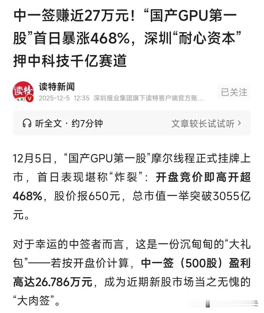 哇,发了,发了,赚大发了!新股摩尔线程今日上市,只要有投资者中最小一签500股,就能赚26万多块钱啊,真是造富神股啊! 摩尔线程的创始人张建中,曾在世界第一市值近5万亿美元的公司英伟达任职长达14年,辞职回国创立了摩尔线程公司,今天刚上市场,市值最高突破3000亿啊 也有媒体报道称,有资本曾在早期投资摩尔线程,如今回报率高达超6000倍,可谓投资之神啊