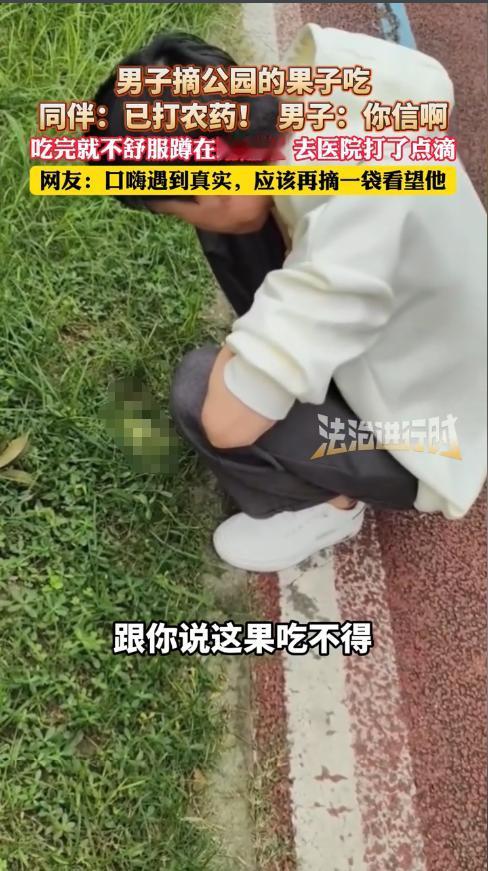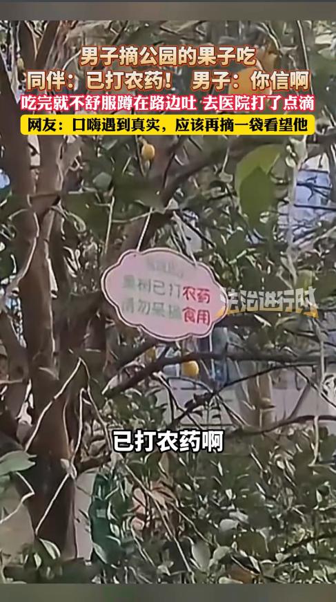 “胆子真大!”近日,四川,一男子和朋友逛公园时,见树上的果子已经成熟,就摘了一个打算吃,朋友急忙提醒打农药了,男子却觉得那是骗人的,擦了擦就吃,结果没多久,男子就恶心、呕吐起来,最后去医院打了吊瓶!网友:这下后悔了吧。 现在城市为了美观,会在公园里、马路旁栽种一些绿植,其中不乏很多果树,通常这些植物都有专门的人进行打理,为了让植物少生病,打农药那也是常规操作,所以结出的果实最好不要吃。 据媒体12月5日的报道,事发那天天气晴朗,男子喊了朋友一起出来玩,二人漫步在公园中,突然,树上的果实吸引了男子的注意,他顺手就摘下来一个。 男子刚准备吃,朋友立即阻止了他,指了指旁边的警示牌,上面写着“已打农药,请勿使用”,可是男子却觉得这都是用来唬人的,最终还是把果子给吃了。 可上一秒刚咽进肚子里,下一秒他就感觉胃里一阵翻江倒海,蹲在路边呕吐起来! 朋友在一旁还不忘幸灾乐祸,不让你吃非得吃,这下好了,出事了吧。随后,朋友将男子送去医院打了点滴,身体这才好转了一些。 网友看后表示,真当人家制作那块牌子不花钱啊,既然挂上去了那就得信,别为了贪这点小便宜而尝试,根本不值得,打针的钱都能买好几斤果子吃了。 信息来源:《男子摘公园的果子吃,同伴:已打农药!男子:你信啊,吃完就不舒服蹲在路边吐 去医院打了点滴,网友口嗨遇到真实,应该再摘一袋看望他》法治进行时