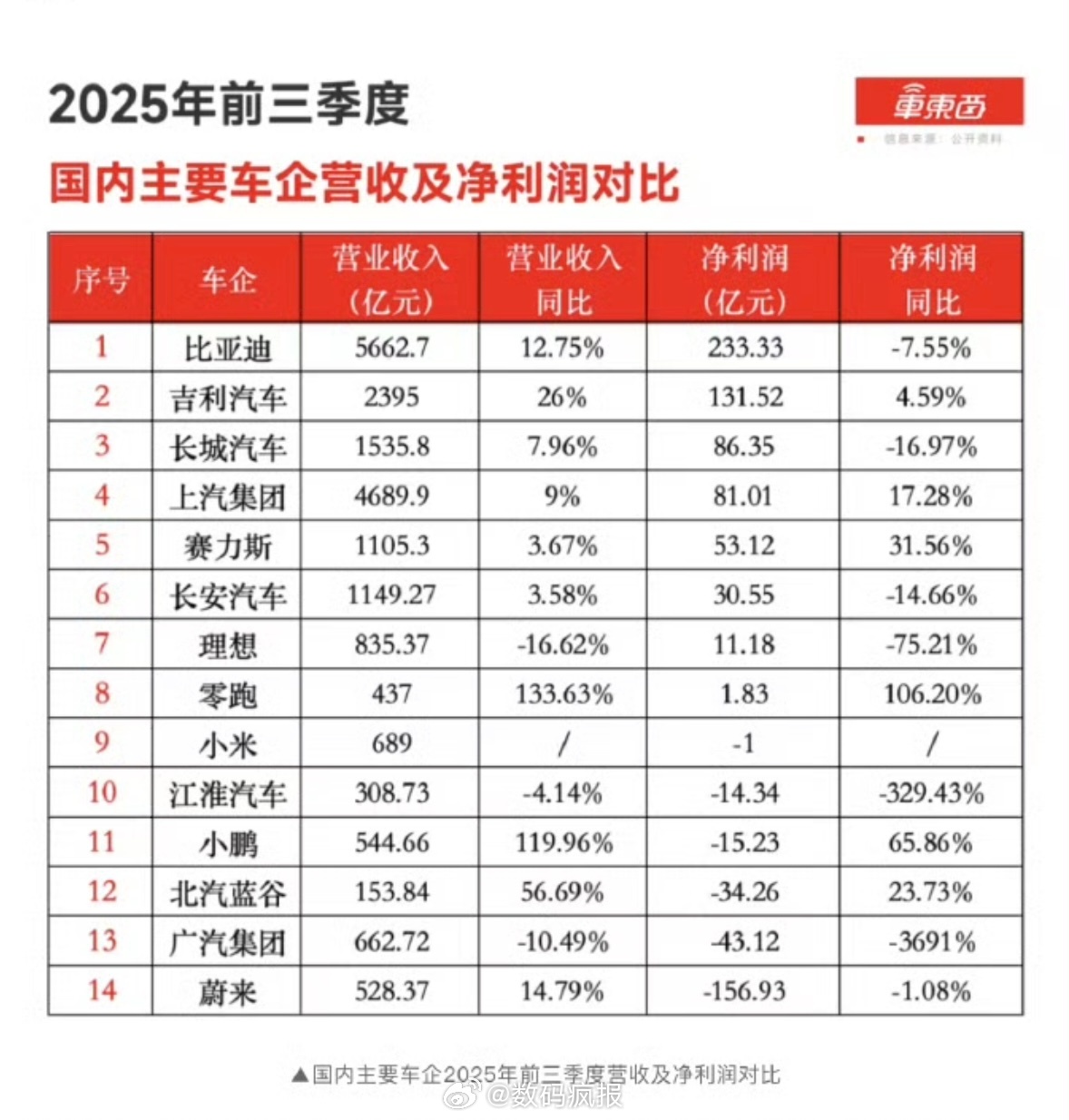 车东西做的汇总,今年前三季度14家国内车企净利润为364亿元,比亚迪一家净利润达到233亿,独占总利润的64%。