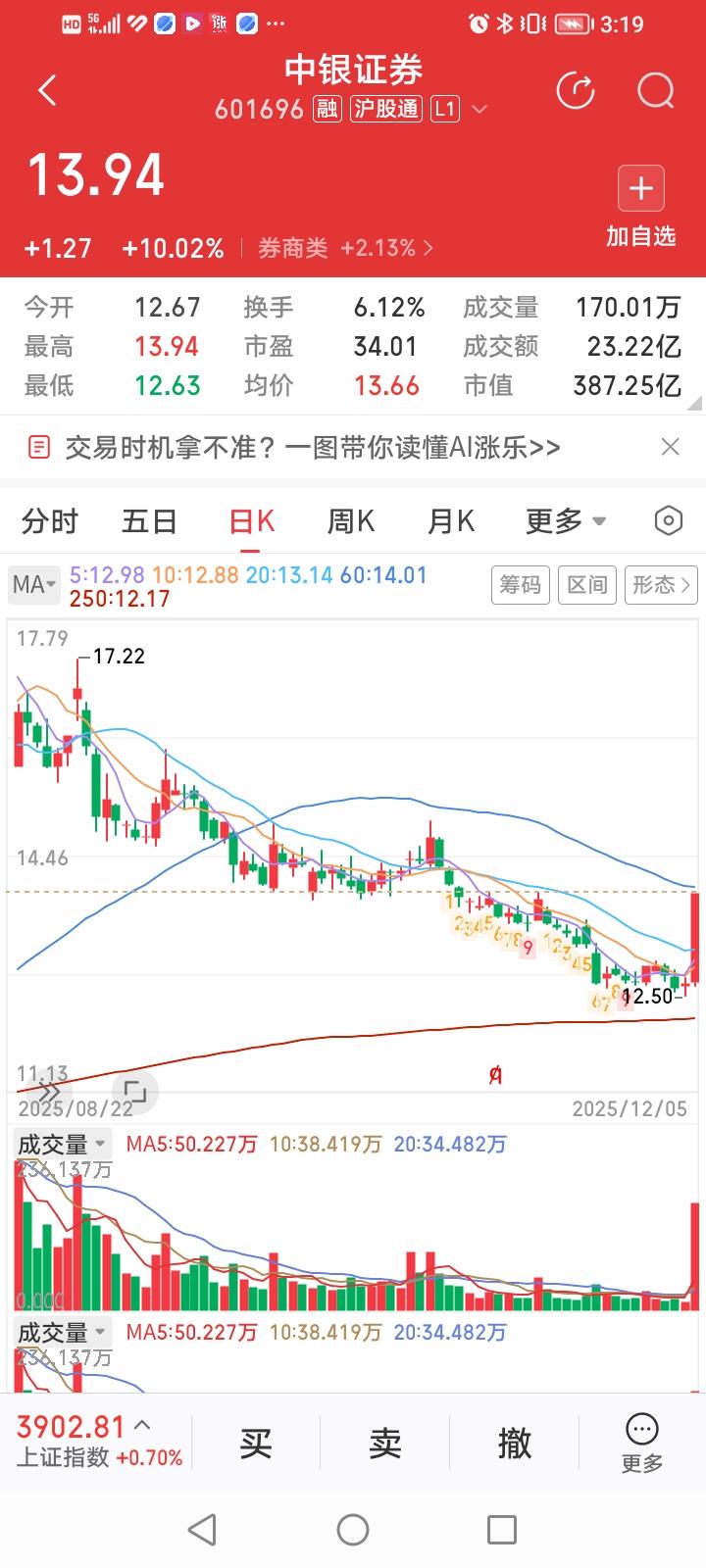 券商股涨停板重出江湖!今天中银证券收盘涨幅10.02%,以涨停板报收。 券商股连续调整了三个月,期间基本没有涨停板了,似乎也该调整到位了。今天终于出现了一个涨停板,是否意味着券商股行情开始复苏走强了? 如果下周一券商股行情能持续活跃,说明牛市先锋券商股已经率先止跌回升了。