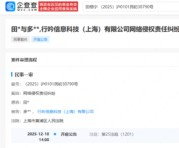 【田栩宁维权案将开庭 】田栩宁维权 企查查APP显示,近日,法院公开田雷(田栩宁)起诉多某某等相关网络侵权责任纠纷案件新增开庭公告,该案计划将于12月10日开庭审理。据此前方名誉维权案件进展显示,针对多某某诉讼追责一事,法院于2025年10月14日正式立案。
