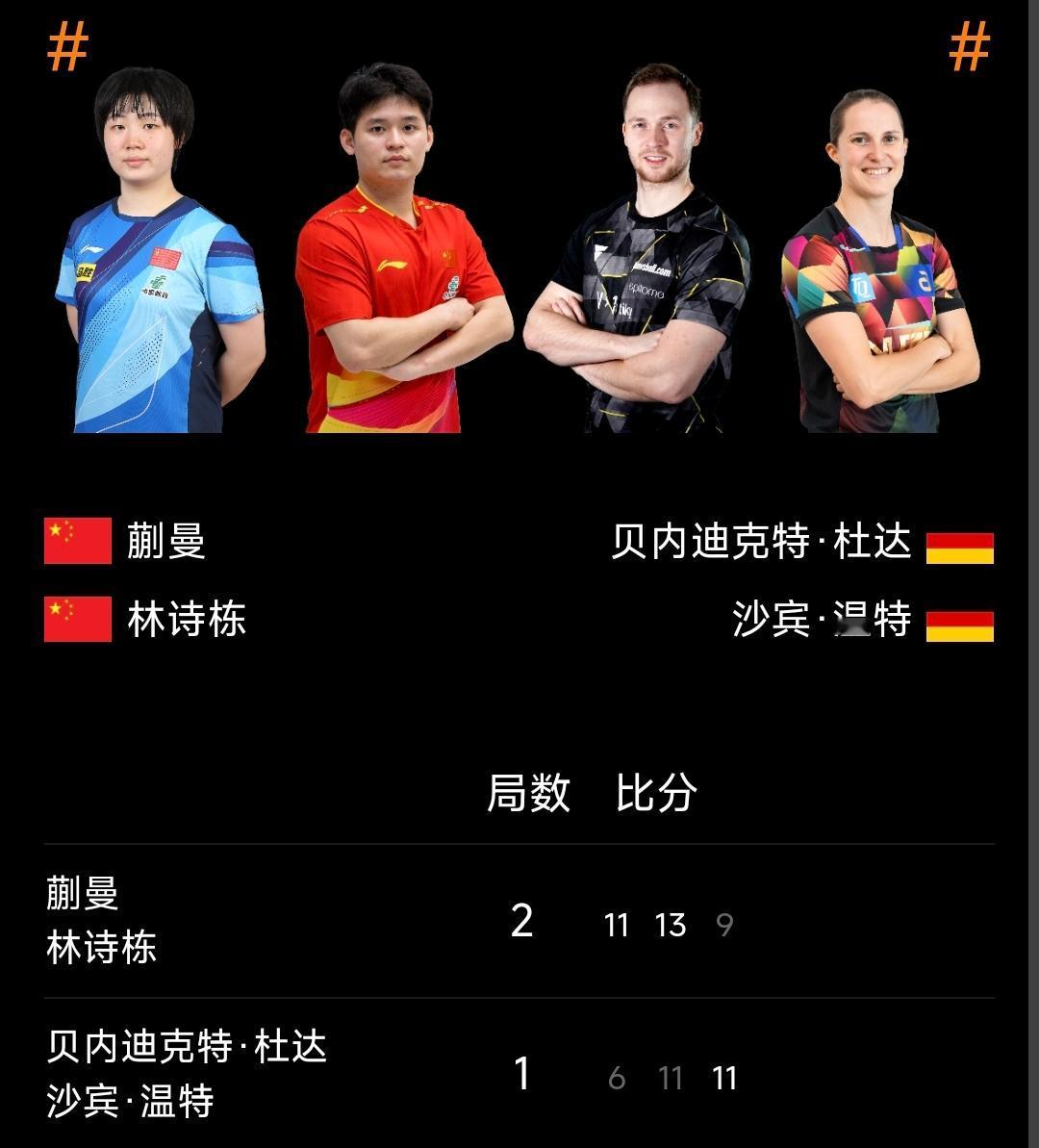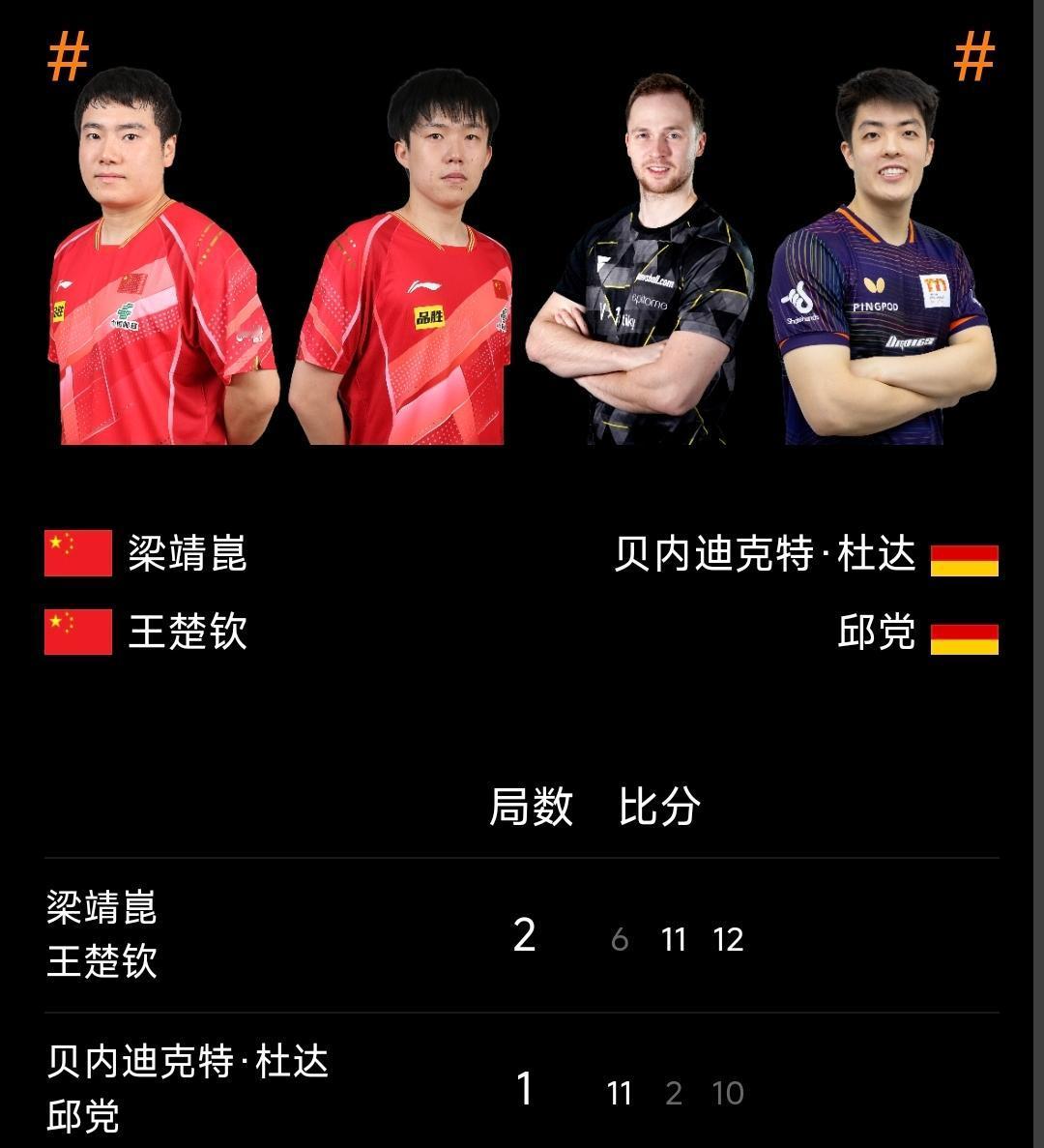 混团世界杯丨中国8-4德国,王楚钦丢2分 2025年成都混合团体世界杯 第二阶段循环赛,中国队派全主力出战以8比4力克德国,将连胜继续,排名榜首! 首盘混双,德国队积极变阵,杜达与温特出战林诗栋与蒯曼,经过三局比拼,林诗栋/蒯曼2-1胜出;第二局德国7-0打出一波高潮,但还是被林诗栋/蒯曼13-11扳回来了,相当不错! 第二盘,孙颖莎上场,一波3比0战胜米特兰姆,为国乒扩大战果,孙颖莎的场次总是让人放心!国乒总比分5-1领先; 第三盘风云突变,王楚钦上场对阵弗朗西斯卡,前两局王楚钦以10-12和3-11丢掉,第三局王楚钦爆发,7-0开局,以11-7拿下一局! 三盘过后德国将总比分迫近:3比6! 第四盘,双打,王楚钦连续比赛,梁靖崑/王楚钦对阵邱党/杜达,首局杜达/邱党以11-6胜出,德国队将总比分追至4比6; 第二局,梁靖崑/王楚钦5-1开局,一波得分以11-2顺利拿下,总比分扩大至7比4; 第三局,国乒组合攻势不减,12-10拿下制胜分!国乒以总比分8比4战胜德国! 恭喜国乒!