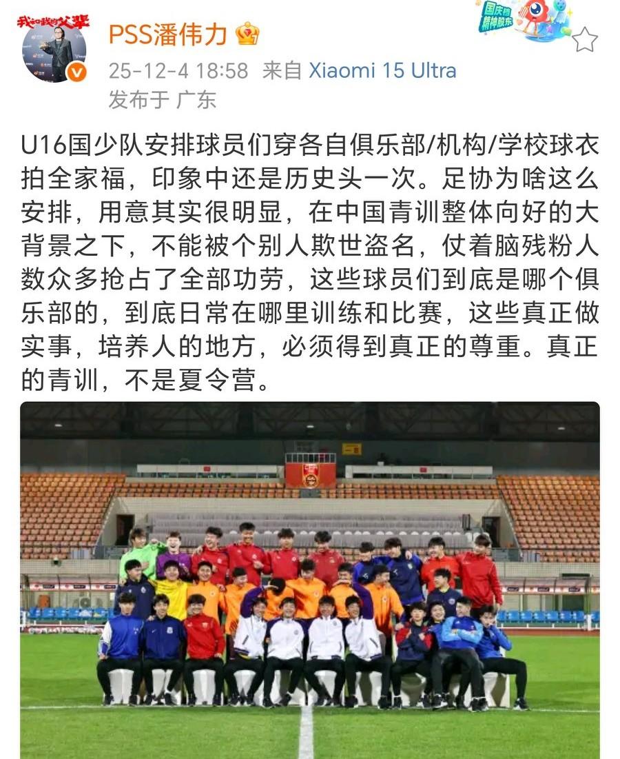 U16国少赛后合照一事,闹的沸沸扬扬,知名足球媒体人潘伟力表示:“足协特意这么做,就是怕被个别人欺世盗名,仗着脑残粉人数众多抢占了全部功劳。这些球员们到底是哪个俱乐部的,到底日常在哪里训练和比赛,这些真正做实事,培养人的地方,必须得到真正的尊重。真正的青训,不是夏令营。” 潘伟力说的情况确实存在。一些极端粉丝开始阴阳其他青训,骂足协等情况屡见不鲜。 对于这一批中国国少,确实让人眼前一亮,现在来看是亚洲靠前的,但是关键看后期的发展。未来三四年非常重要,如果不早一点拿到职业合同。到18-19岁没有留洋,或者还踢不上中超。还在中甲中乙混,其实发展空间也不大,很大一批可能还会平庸。 所以我们说,董路是有功劳的,他最大的功劳是能摇人,能组织出国比赛,不受一些条条框框的约束,让更多人知道并参与进来,这一点是值得肯定的。 现在需要放下一些争议,怎么让这批孩子发展好,而不是内耗。