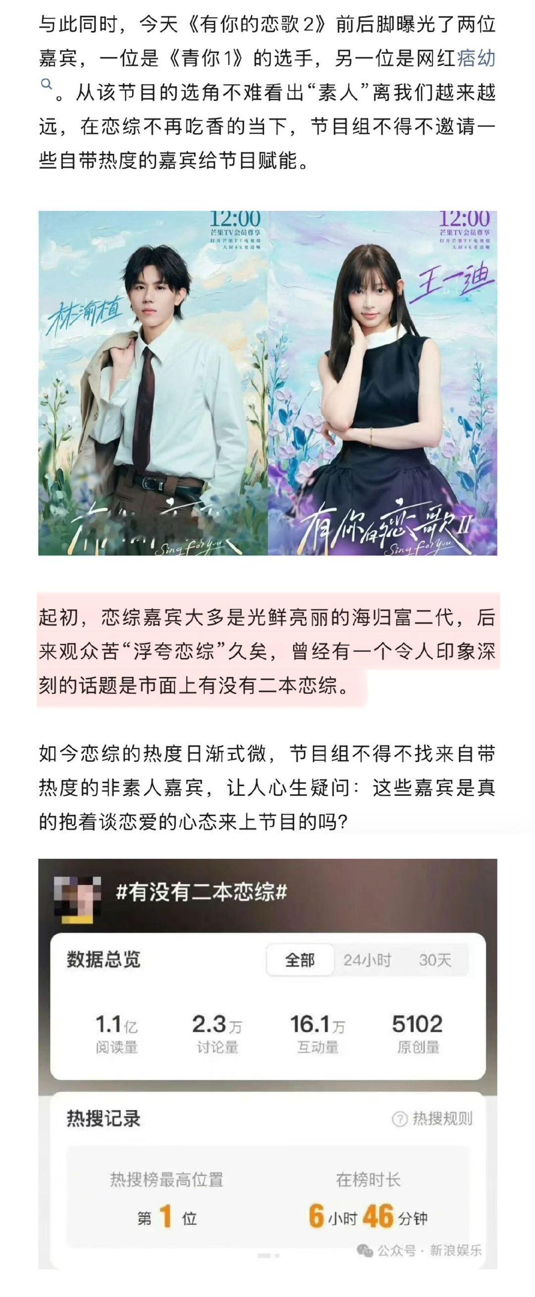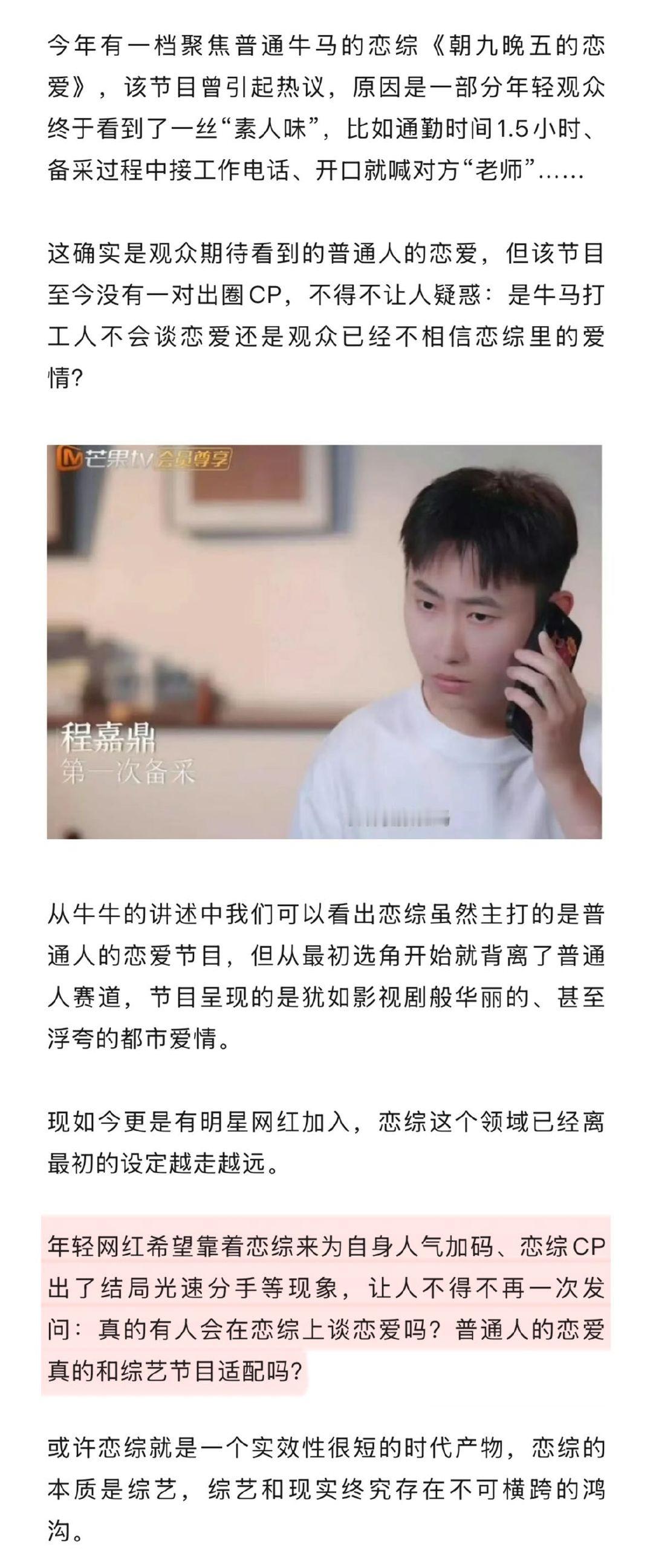 恋综是通往娱乐圈的大门吗业内谈恋综选角标准 普通人恋综为何没出路?《朝九晚五的恋爱》还原打工人恋爱却无出圈CP,而明星网红恋综靠争议刷屏。从海归富二代到明星网红,恋综离“普通人”越来越远,是观众不爱看真实恋爱,还是恋综早已背离初衷?