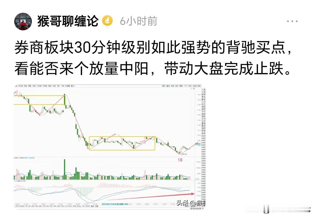 早上发文明确指出,券商板块30分钟级别的背驰信号非常强烈,有望收个放量中阳,带动大盘完成止跌。目前看比我们预期还要强势,直接来了一根倍量大阳,一根穿云线突破了中枢平台,既然突破,那就压力变支撑,后面只要不再破中枢上沿,短线就可维持看多。