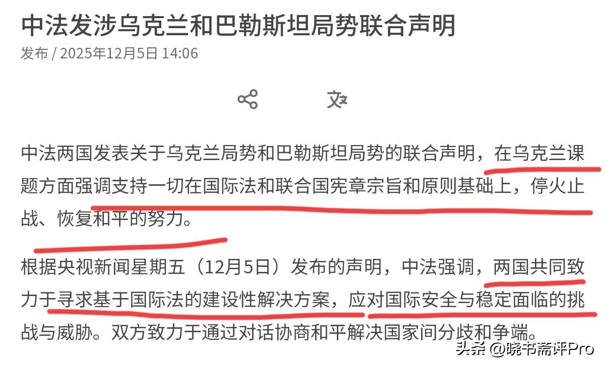 中国的这一表态,法国和整个欧洲都吃了一颗定心丸!美俄两国正讨论相关方案,但中国表达了自己独立的看法!12月5日,根据外媒报道,外媒称,中法两国发表关于乌克兰局势和巴勒斯坦局势的联合声明,而在乌克兰问题上,中法两国的联合声明是这样写的,那就是在乌克兰课题方面双方强调支持一切在国际法和联合国宪章宗旨和原则基础上,停火止战、恢复和平的努力。 中方表态“支持一切在国际法和联合国宪章宗旨和原则基础上,停火止战、恢复和平的努力”,这句话是什么意思呢?那就是对于乌克兰的领土的处理,我们的态度是,不得违背国际法,不得违背联合国宪章。很显然,这一表态,可以说这是马克龙访华在俄乌问题上获得的最大收获之一。一句话,中方支持在国际法和联合国宪章的基础上解决俄乌问题。 当然,明眼人也看出来了,中方的立场与美国提出28点和平方案是有一些距离的。尤其是美国的方案明确表示,克里米亚、卢甘斯克和顿涅茨克归俄罗斯所有,且包含美国在内的各方需承认这一归属。很显然,美国的方案明显是以胁迫手段施压乌克兰割让领土,这无疑是违背国际法和联合国宪章的行为。 事实上,中国一贯支持乌克兰的领土与主权完整,主张领土争议由俄乌双方通过对话协商自主解决。在美俄意图达成交易,乌克兰承受巨大压力,而欧洲感到势单力孤之际,中国的这一表态,这对于欧洲来说,可谓非常的重要。一句话,中国是秉持客观公正的立场,坚定的捍卫联合国秩序,我们无疑展现了负责任大国的担当。