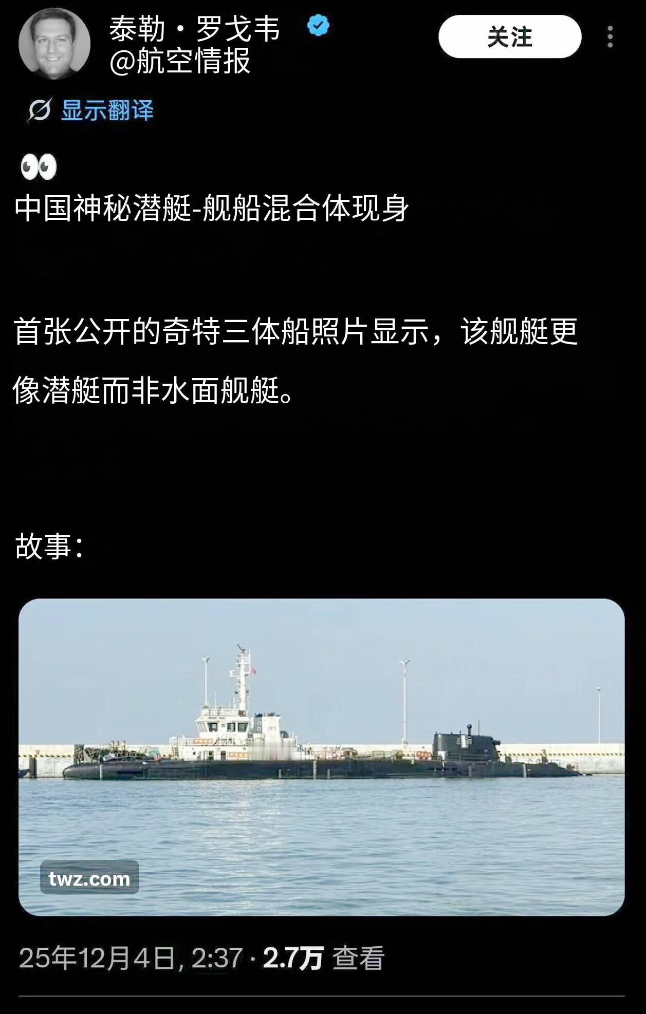 外国人又发现了一个东大的新玩具,完全不像是水面舰艇,但是说像潜艇吧?又不是潜艇。 据说是半潜船,可以一半水里一半水面。反正就是很奇特。 至于作用吗?外国人猜测说是无人潜艇母舰,可以搭载很多小型无人潜艇。 不过到底是不是,那就只有等东大官方自己公布了。