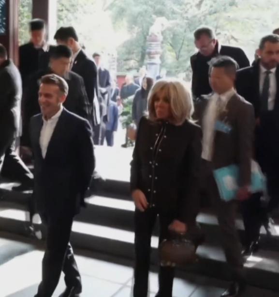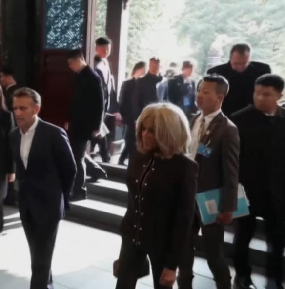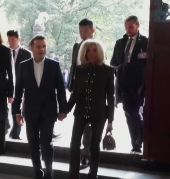 12月5日马克龙携手妻子布里吉特参观都江堰!这对老妻少夫十分恩爱,手牵手边走边参观,或许这就是属于法国人的浪漫。 总统先生这次打扮比较休闲,并没有系领带,选择的衬衫也是休闲款,时而牵着妻子的手时而双手背后,仍有总统的威严感! 夫人布里吉特并没有选择穿裙装,而是上身穿长袖,下身配同色系裤装,一身时髦的套装穿在身上勾勒出迷人身姿,尽管套装的颜色深,但看起来也减龄!