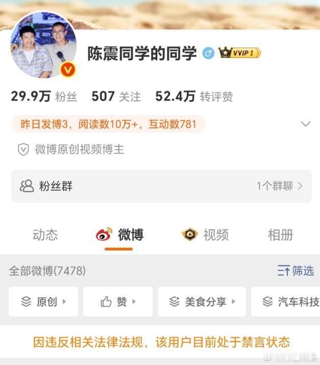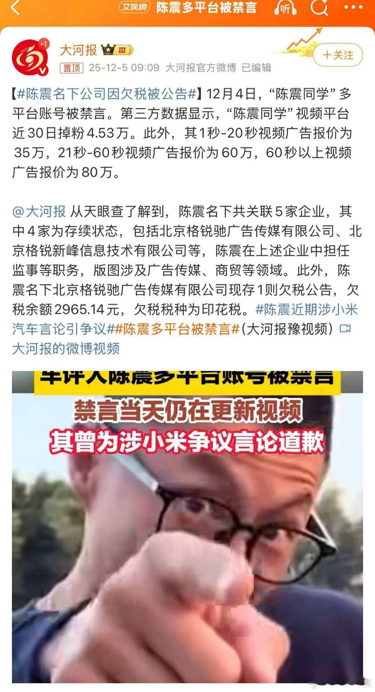 陈震偷税追缴并罚共计247.48万元陈震应该是第一个被查税爆出来并禁言的车评人吧?算是汽车圈里的典型了。近些年公众人物因偷税漏税被封杀的太多了,陈震虽是自媒体,但是名气大流量大,基本上就告别公众视野了。以前是手机,现在是汽车,有些“测评”自媒体本质上和敲诈勒索差不多。
