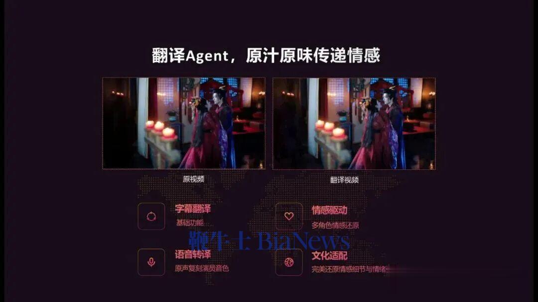 这个屏幕是指七星Agent里比较突出的功能,它是一个翻译Agent,大家可以看一下左边是翻译之前的内容,右边是翻译之后的内容对比。它不仅是单纯的翻译,同时具备了情感以及场合适配的体系,可以准确捕捉不同演员的台词、情绪以及起伏,可以充分还原,让海外用户看到翻译之后的内容也可以达到共情的感觉。