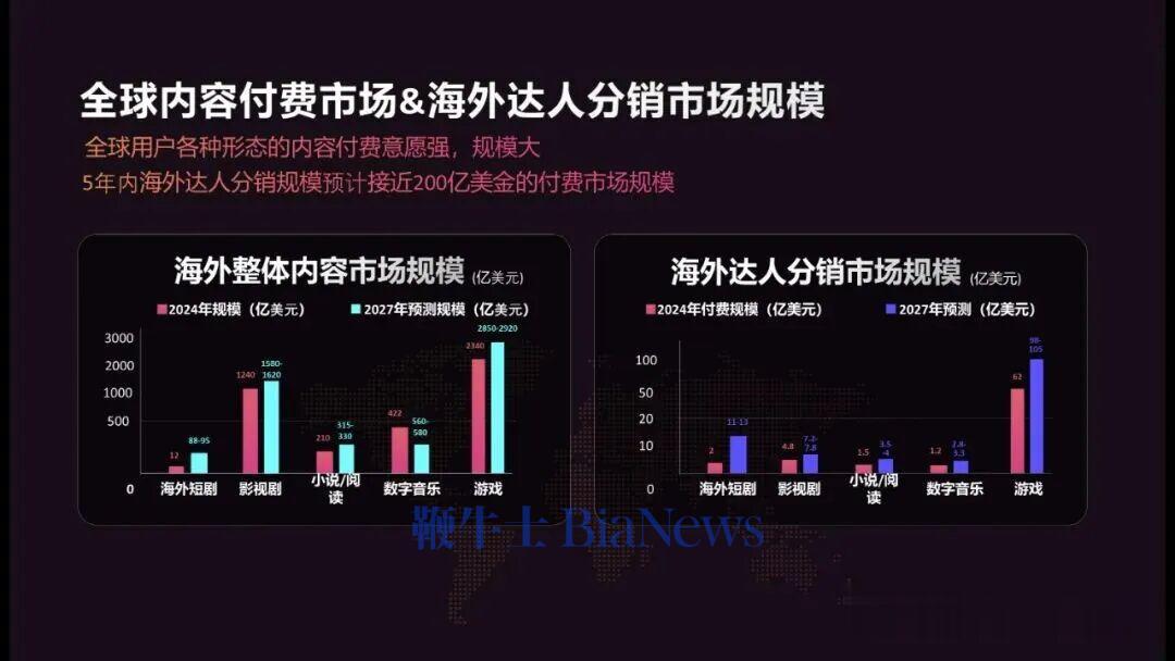 比较小的是海外短剧市场规模,右边是海外达人分销市场的数据,截至2024年,这个规模是100亿左右,2027年预计会突破200亿美元左右市场规模。