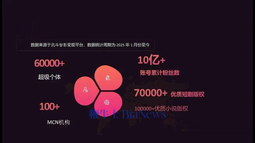 胡博涛表示,北斗智影上线十个月来,已助力6万个超级个体、100家出海MCN增长创收,合作账户累计粉丝超10亿;同时与30+头部版权方合作,拥有7万+短剧、10万+小说版权,并向日本、东南亚等市场推漫剧版权,累计为创作者及机构带来超5000万收入,部分个体月入达50万。