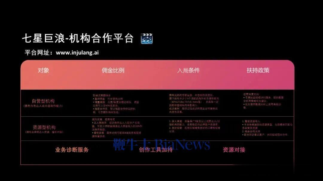 总体来说,我们对以上两类机构有三类扶持项目:第一,业务诊断服务,比如自营团队,有一些是做国内自媒体,有一些是做海外电商媒体的,但是和海外内容媒体不相干,我们会以最短的时间介入,分析你们的团队特质,帮助你们在海外内容分销领域做到最好。第二,工具类加持,刚才提到除了七星Agent这种视频制作工具以外,还有一些toB的版权、翻译以及配音能力,也可以和版权方深度绑定,帮助你们以最低成本做出海业务。第三,资源对接,我们的B端业务比较丰富,对接的资源也比较丰富,各行各业,我们会把资源共享,让机构可以在里面真正受益。