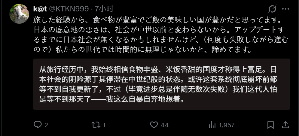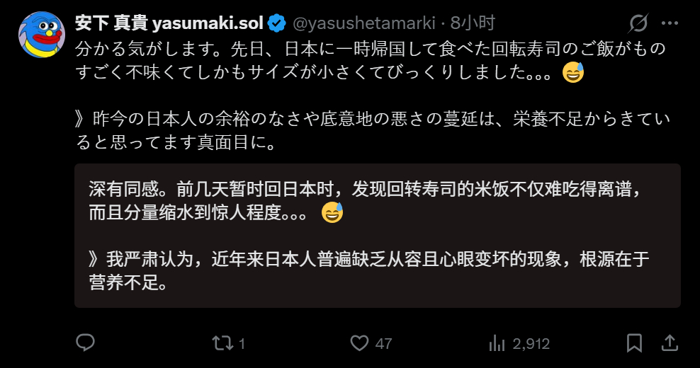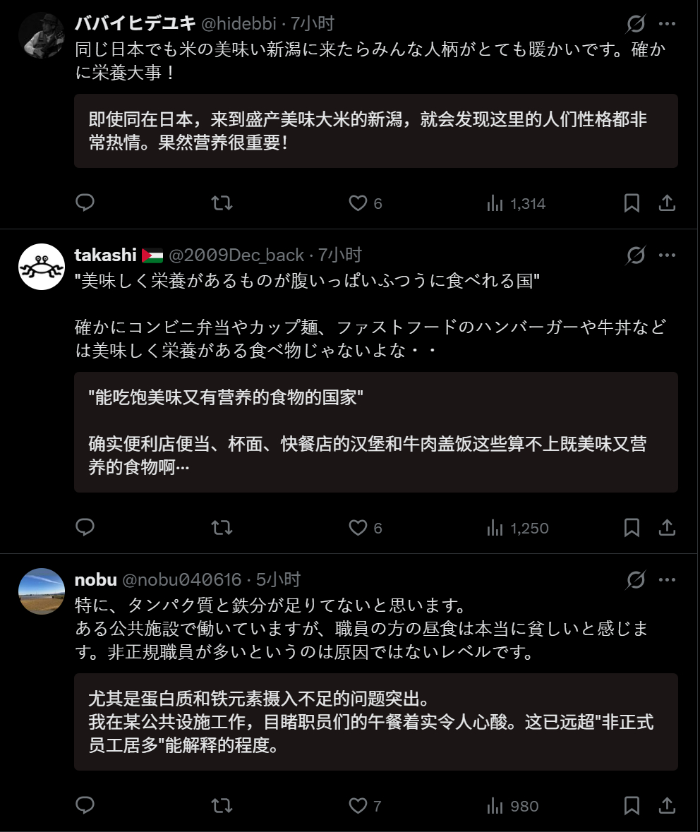 🔻网友分享,有日本人主动分享说:“我在多米尼加时就已察觉日本的贫困,但去了中国和印尼后,这种认知彻底成型了。能日常饱食美味营养食物的国家,仅凭这点就已不算贫困。基础设施落后或缺陷等问题都可暂缓考虑。我认真认为,近来日本人普遍缺乏从容与心怀恶意的现象,根本原因在于营养不足。”🔻意思就是日本人真的吃不饱。🔻奇怪的是评论区骂她的日本账号居然不多,看来“吃不饱”这件是真的伤到它们了。日本再将7800吨核污染水排海热点现场海外新鲜事