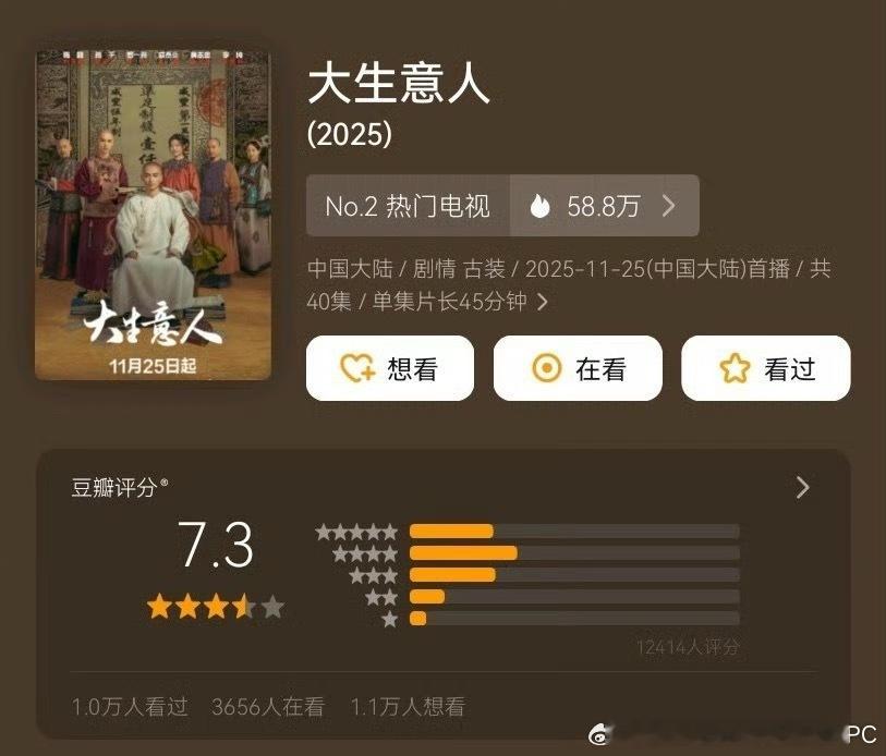 迪丽热巴陈星旭《枭起青壤》豆瓣开分6.3陈晓孙千的《大生意人》豆瓣开分7.3