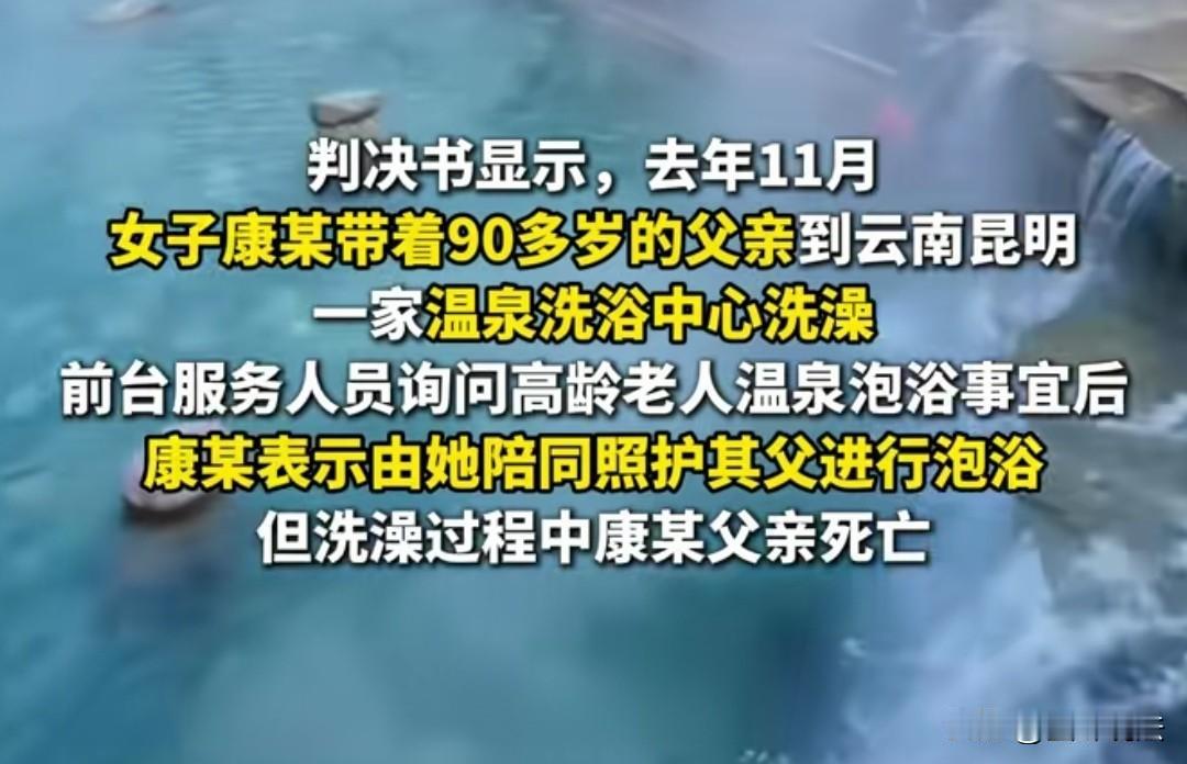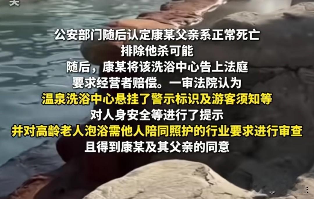云南昆明,女子带90多岁的父亲泡温泉,洗浴中心觉得老人年龄大了,本想要拒绝女子的,可女子表示她会陪同照护其父进行泡浴,在女子的再三保证之下洗浴中心同意了,可最终女子父亲在洗澡过程中死亡,女子一纸诉状把洗浴中心告了。 康女士看着90多岁的父亲,想着辛苦了一辈子的老人,子女有能力的时候应该给他享受享受。 康女士平时有时间会带父亲游玩,但因为父亲年纪的原因,游玩的地方选择的都是附近的。 有一次,康女士的父亲和她说,听别人说泡温泉很舒服,他也想去体验一下。 父亲偶尔会有要求,康女士也不是扫兴的人,基本会答应父亲的要求,每次父亲都会开心的像个孩子。 去年11月的某天,康女士正好有时间,于是应父亲的要求带他去泡温泉。 在泡温泉之前,康女士也想过父亲年纪大了,洗浴中心可能会拒绝,但为了圆父亲的心愿,她还是打算试一试。 果然,来到洗浴中心,工作人员得知老人要泡温泉,而且对方已经90多岁了,就开口拒绝,并说明了理由。 康女士就知道会这样,所以她来之前也跟父亲说了这情况,还商量了出现被拒绝之后俩人如何应对的措施。 一听到被拒绝,康女士就说她会照看好父亲,不会让他出事,一再保证不会让洗浴中心负责。 而康女士的父亲说他是真的很想体验一下泡温泉,还说自己一大把年纪还讹人不成,他会小心的,有什么事自己承担 。 俩人的态度如此真诚,而且老人虽然90多岁了,但身体看上去还挺硬朗的,说话也中气十足。 况且他们自己一再保证了,万一有什么事也不会找洗浴中心麻烦。 他们是开门做生意的,客人都如此诚恳了,他们也没有理由再拒绝,于是就答应了。 但不怕一万就怕万一,工作人员还是提醒了康女士他们注意事项。 而且店里也做了相应的提醒,工作人员觉得应该不会有什么事的,他们买票后就让他们进去了。 但万万没有想到,康女士父亲在洗澡的过程中竟然不幸离世了。 发生了这样的事,双方都选择了报警。 公安部门随后认定康女士父亲系正常死亡,排除他杀可能。 当时洗浴中还松了一口气,因为当初康女士和其父亲表示出事不会要他们负责,如果是他杀,洗浴中心感觉他们估计要负责相应责任,既然是自然死亡,那他们就没有责任。 可当初这么说,不代表出事后真的不追究责任,康女士立马表示其父亲实在洗浴中心出事的,洗浴中心肯定脱不了关系,要求他们负责。 洗浴中心反驳,当时是康女士誓誓旦旦的说会全程对其父亲负责的,其父亲也说不要他们负责的,而且店里也悬挂了警示标识及游客须知等,对人身安全等进行了提示。 而且也口头询问了老人的身体状况,也告知康女士其父亲泡澡时一定要照看好,他们已经尽到了合理范围内的安全保障义务,和他们有什么责任。 康女士要求赔偿的目的洗浴中心没有满足,于是一纸诉状把洗浴中心告上了法庭。 《民法典》第一千一百九十八条规定:宾馆、商场、银行、车站、机场、体育场馆、娱乐场所等经营场所、公共场所的经营者、管理者或者群众性活动的组织者,未尽到安全保障义务,造成他人损害的,应当承担侵权责任。 也就是说洗浴中心是否要承担责任,要看其是否尽到安全保障义务。 一审法院经过审理认为,洗浴中心悬挂了警示标识以及游客须知,对客人尽到了人身安全的提醒。 同时,该中心在经营场所配备有相关急救设施设备,在康女士父亲出现紧急情况时,工作人员及时拨打120并参与急救,尽到救助义务。 可以说,洗浴中心尽到了一般经营场所应尽的安全保障义务。 但该中心并未取得消防救援机构许可,其投入使用、经营的行为违法。 最终,洗浴中心被判承担20%的民事责任,赔偿康女士等家属3.6万余元。 洗浴中心经营者对一审判决不服提起上诉,二审法院驳回其请求,维持原判。 有的时候不是不欢迎老人进行一些娱乐项目,是害怕要承担责任,毕竟相对于年轻人,老人有很多未知的风险。 作为家人,想要尽孝心,满足老人游玩的要求没错,但是要根据老人的身体健康情况合理安排。