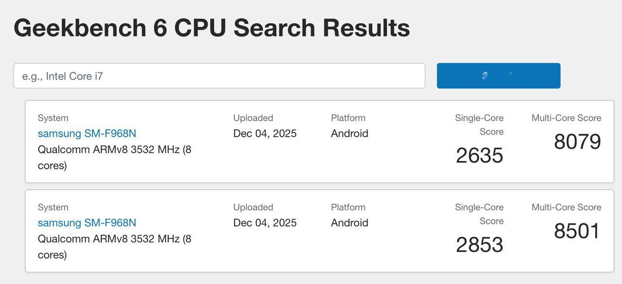 三星三折叠 Galaxy Z ThriFold 的 Geekbench 6 跑分出来了,骁龙 8 至尊版 For Galaxy 处理器,16GB 内存,单核 2853 分,多核 8501 分,只能说这台手机被三星压了太久,8 Elite 都成 N-1 代处理器了。[允悲]
