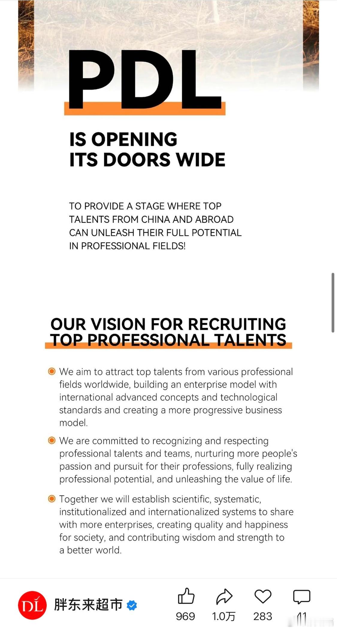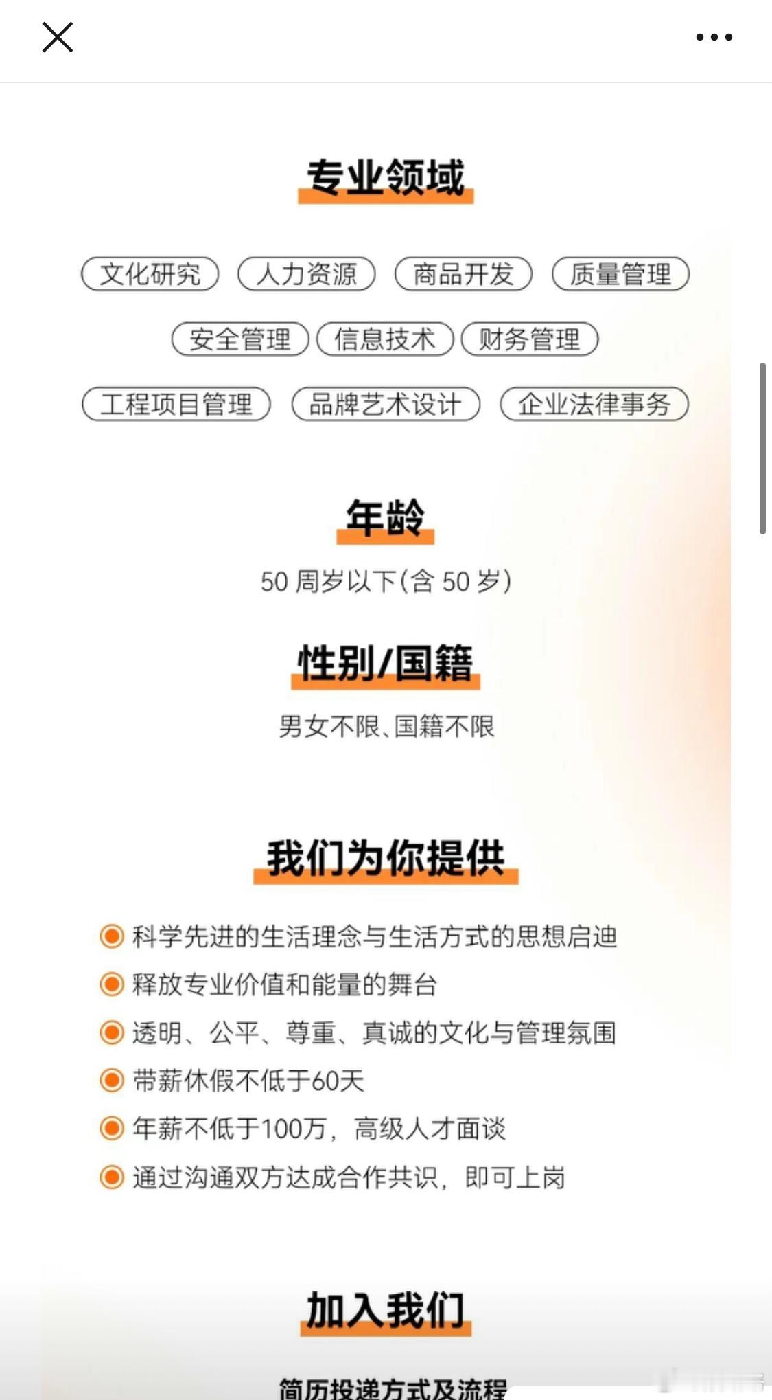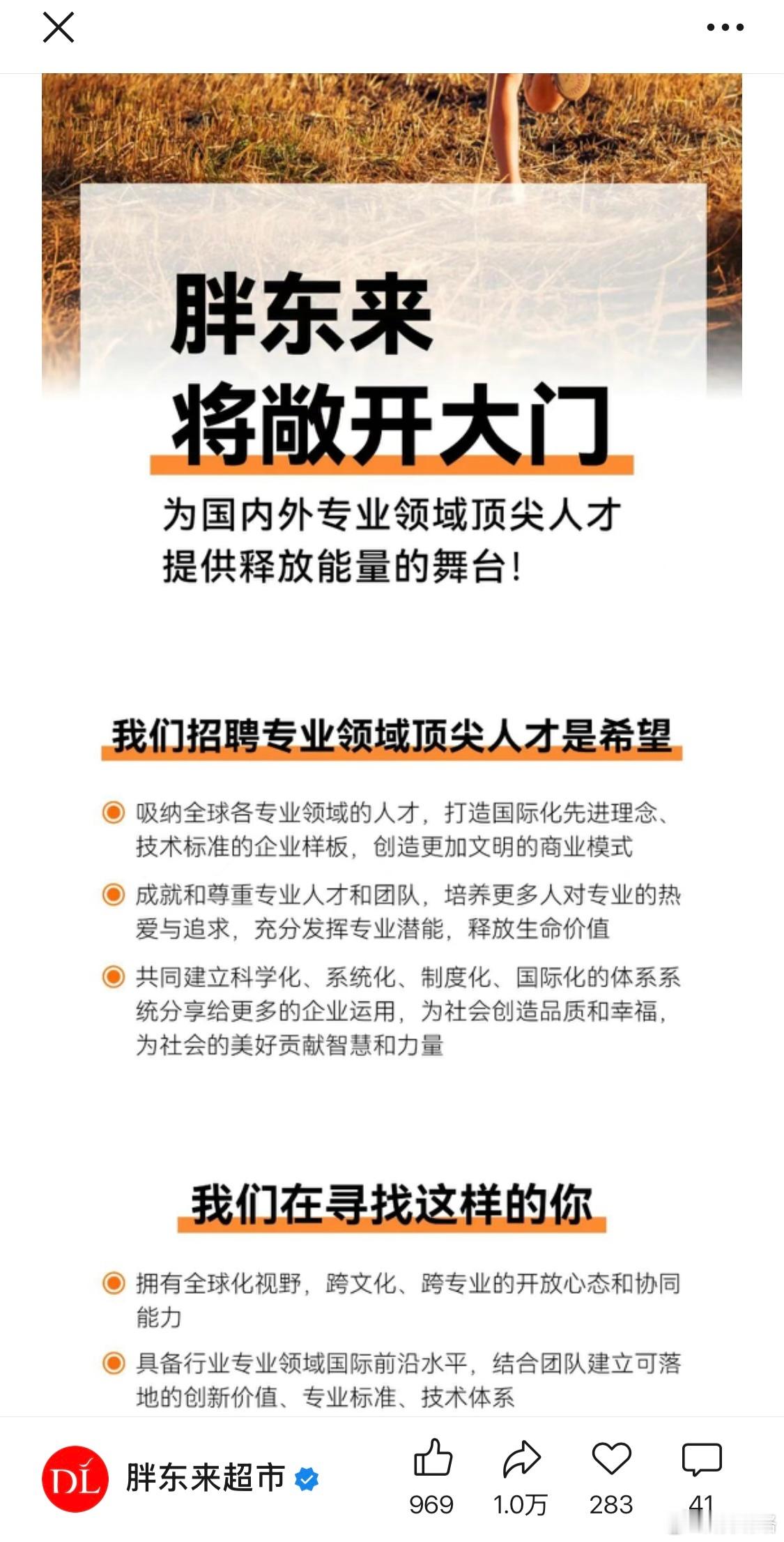 胖东来要做大做强了,招顶尖人才!年薪100万起、带薪休假60天、男女不限、国籍不限,最关键的是年龄在50周岁以下就行我还注意到他们招聘信息上写着“周二闭店”,对一个超市来说,真的很人性化了。还做了中英文两版招聘启事,这真是要走向国际了希望像这样的好老板再多一些,希望胖东来开店再多一些。目前分店大多在都在河南许昌、新乡之前开车去许昌胖东来,那个人山人海啊,排队3个小时才进去赶上上海迪士尼了他们线上超市里的东西也经常是秒没不过东西和服务是真好啊,希望赶快开到我的家乡。胖东来招顶尖人才年薪100万起胖东来招顶尖人才年薪100万起