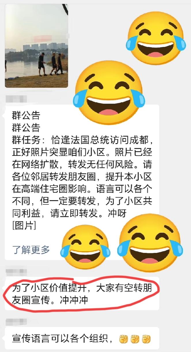 法国总统马克龙到访成都,闲暇之余,在锦城湖公园搞了一次晨跑。这下,附近小区的业主群沸腾起来了,隐隐有借此次马克龙晨跑之机,将小区的房价再提升几次档次的意思! 评论区网友立刻给她们泼了一盆冷水:你叫他咋个提升,原来几千万的房子,卖一个亿吗! 不过,也有网友表示:这个业主群里面发的是万科公园5号的房子,关文儒德小区什么事情! 可不管是哪个小区,成都人的这个还真的是有点神经兮兮的!