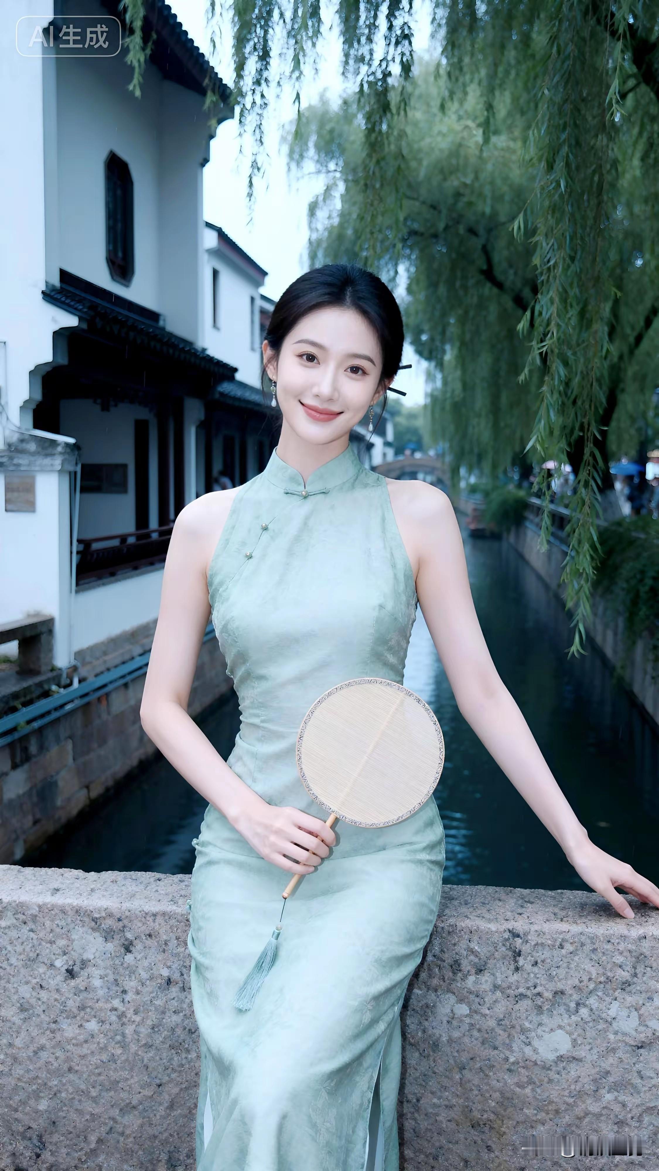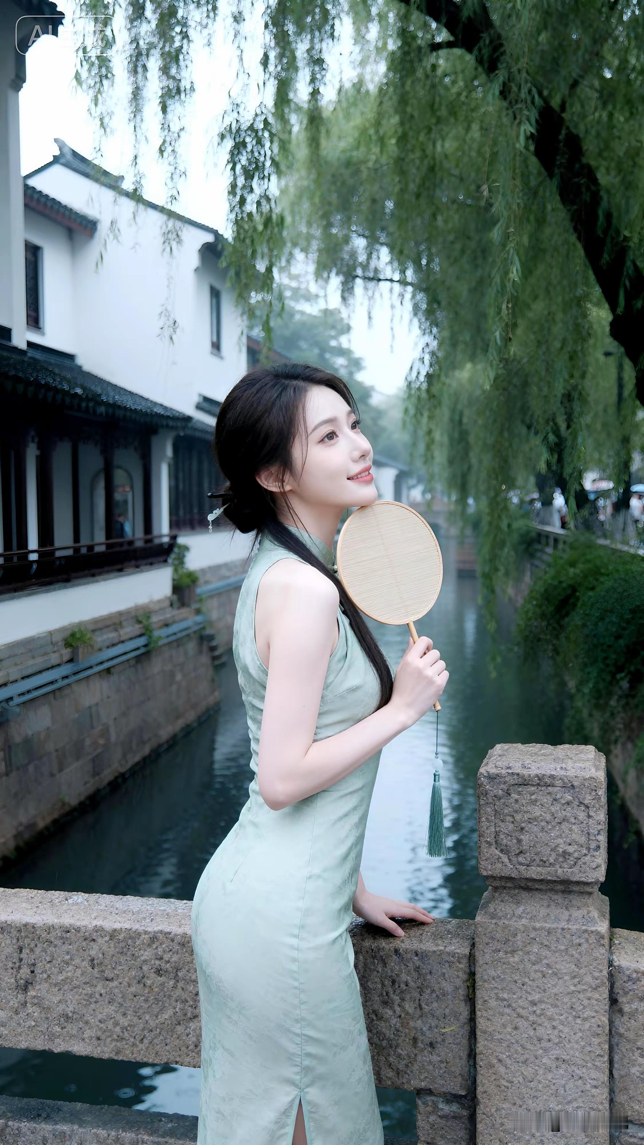 分享一张我相册里的江南照片,照片里是一位穿淡绿色旗袍的小姐姐。淡绿色旗袍温婉雅致,与周围竹林、绿植相得益彰,满是江南水乡韵味。画面中扇子、月饼等元素,更添国风氛围。她往那儿一站,宛如从古典诗词中走来。