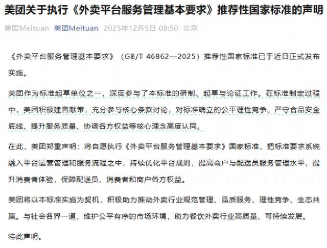 12月4日,美团、京东外卖、淘宝闪购相继发声,表示将自愿执行《外卖平台服务管理基本要求》国家标准,把标准要求系统融入平台运营管理和服务流程之中,持续优化平台规则,提高商户与配送员服务管理水平,提升消费者体验,保障配送员、消费者和商户各方权益。