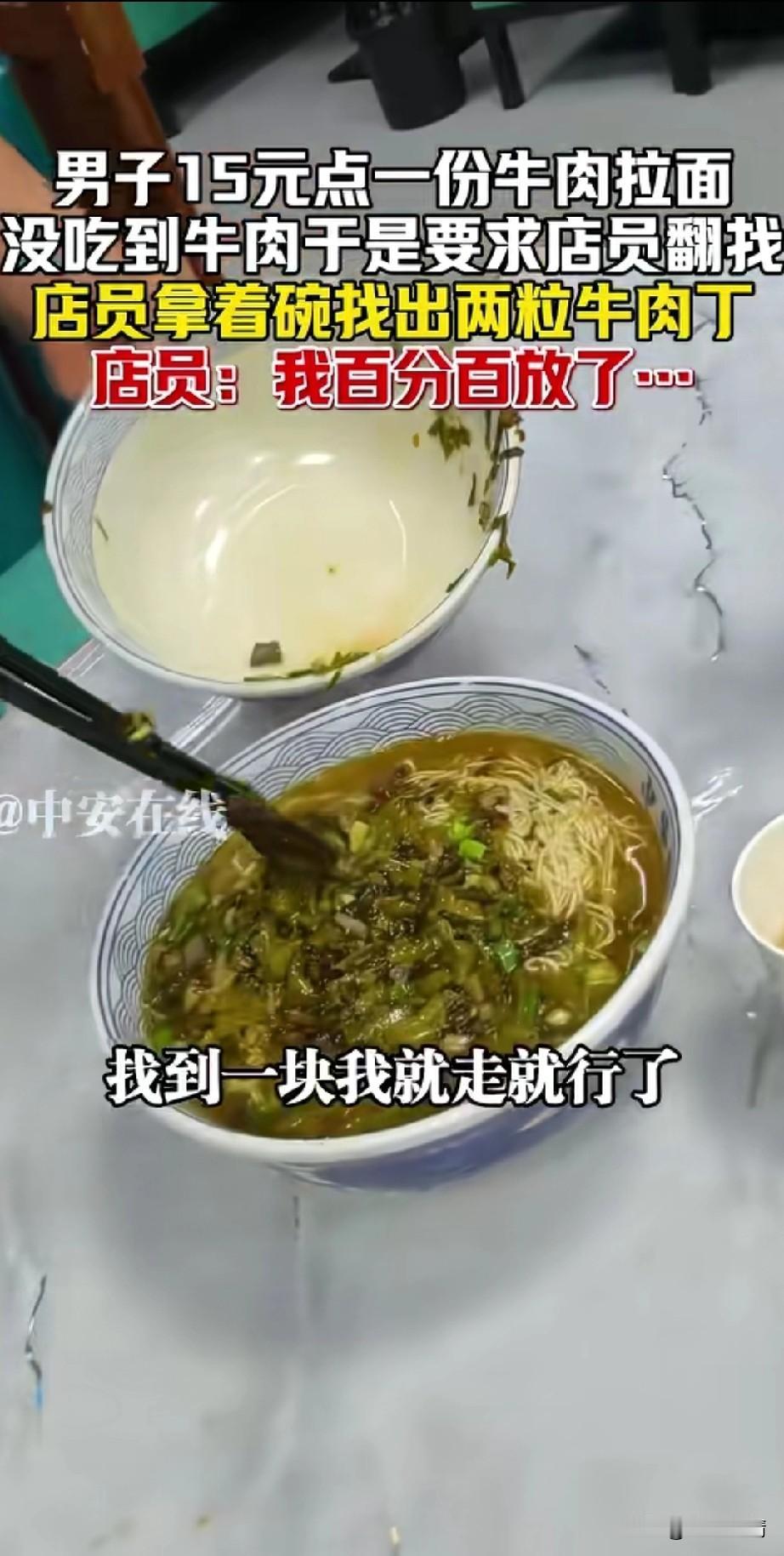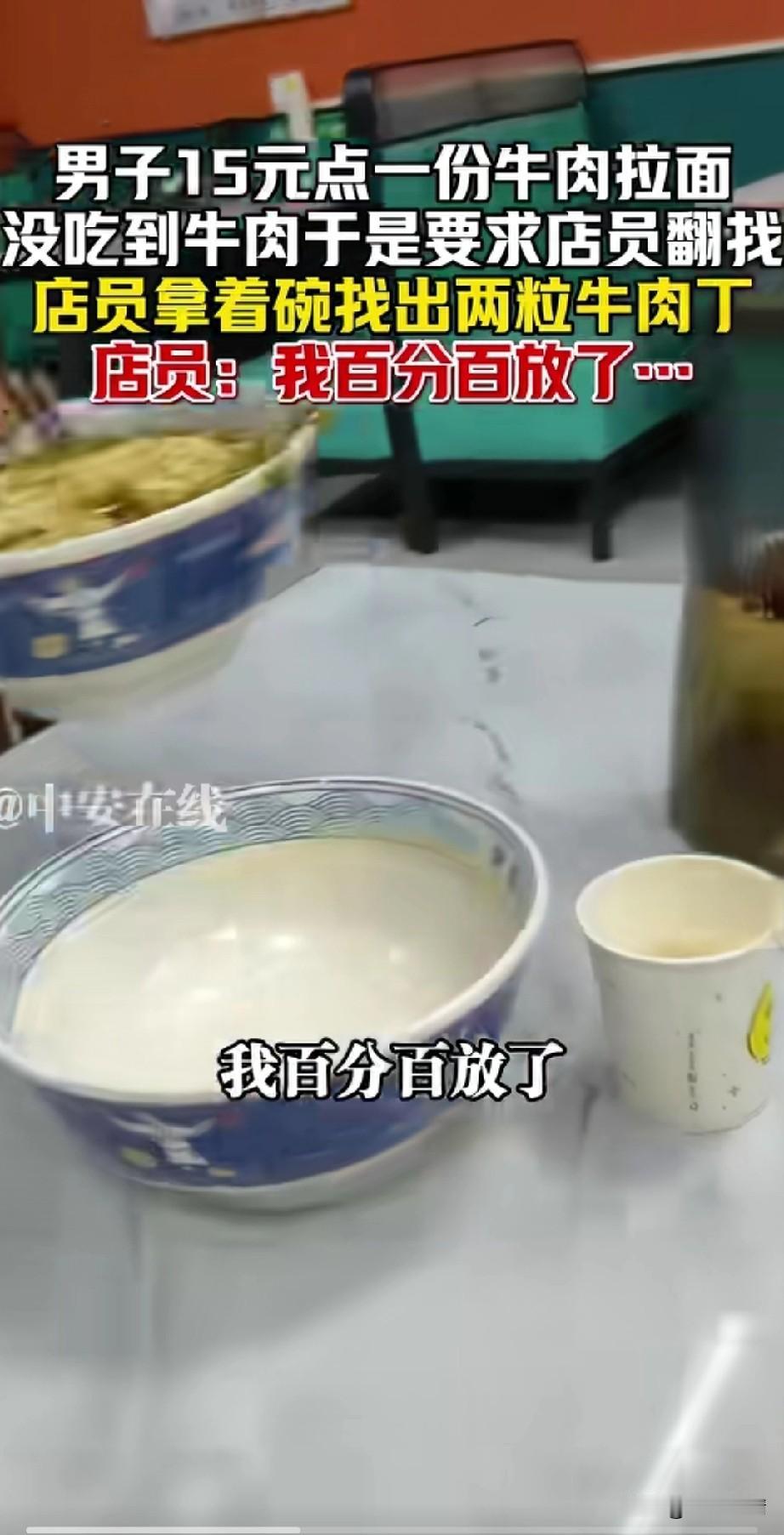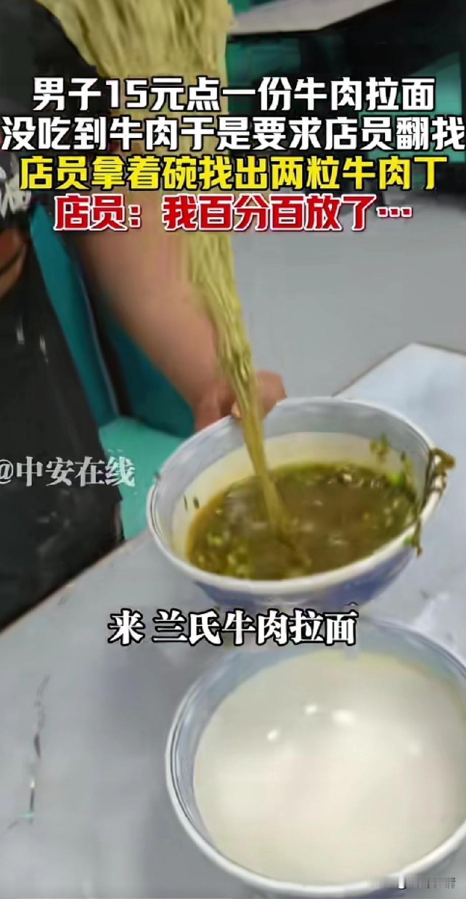 男子花15块点了一份兰氏牛肉拉面, 发现没有牛肉, 就是生气的喊来服务员, 让服务员给他找牛肉, 质问服务员是不是忘记放了? 服务员表示不可能, 100%放了牛肉, 于当着男子的面又拿了一个碗, 男子表示只要你找到我立马付钱走人, 服务员将面倒了出来, 然后用筷子翻找起来, 结果就找到了两小块儿牛肉丁, 吃饭的男子也笑了, 也不想和服务员多说, 直接付钱就走了, 估计以后再也不来这家吃牛肉面了, 毕竟15块钱的牛肉面只有两小个牛肉丁,男子就是这样, 上一次当就够了, 下次就不再去了! 大家觉得兰式牛肉拉面坑人吗? 兰牛肉面馆 兰州兰记牛肉面 兰式牛肉面 兰之味牛肉面 牛拉面