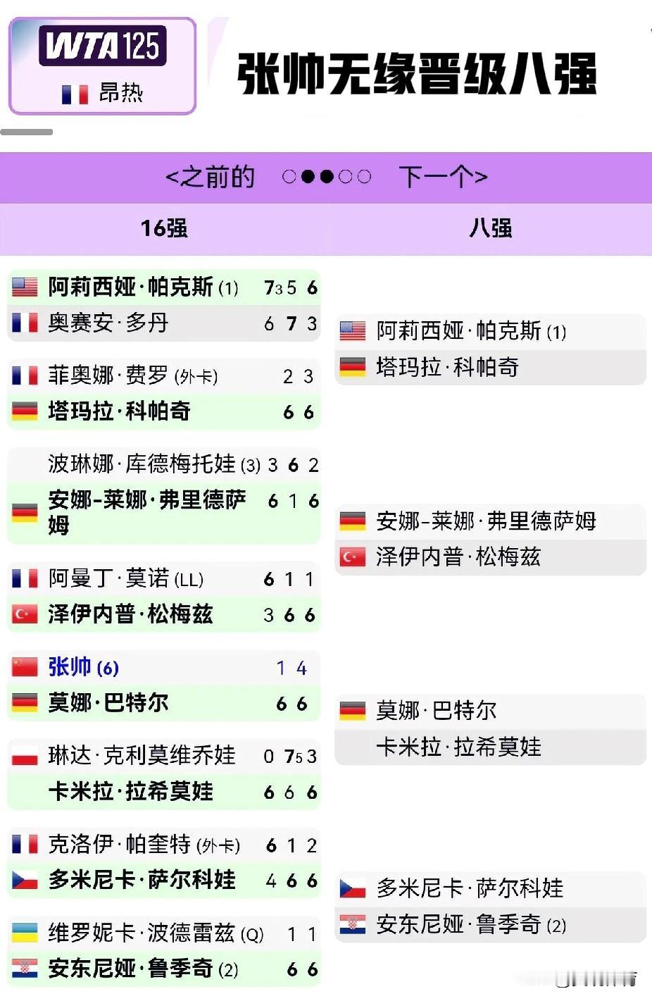 张帅:不敌德国选手莫娜·巴特尔,无缘晋级法国昂热WTA125级别公开赛八强。在1