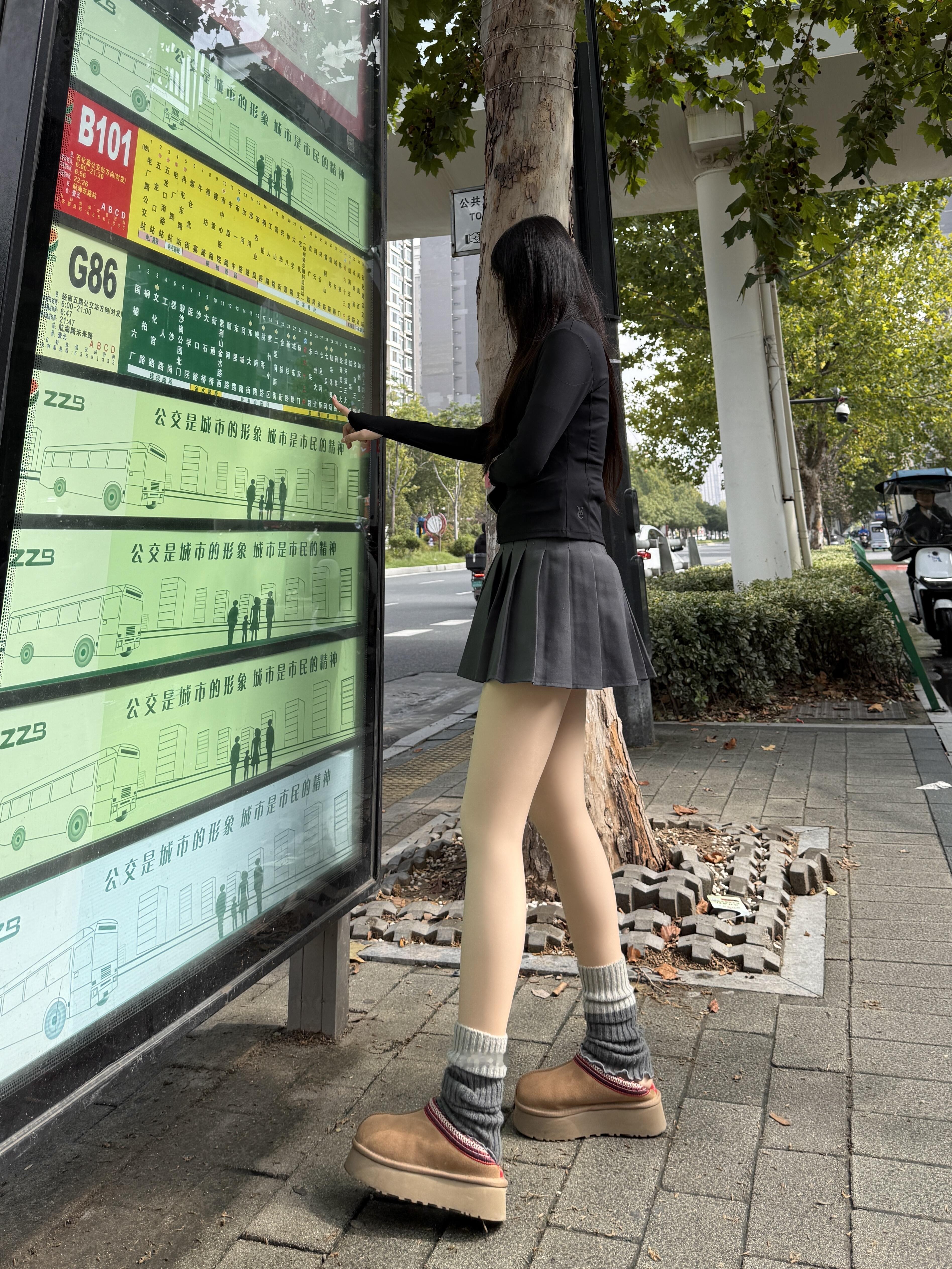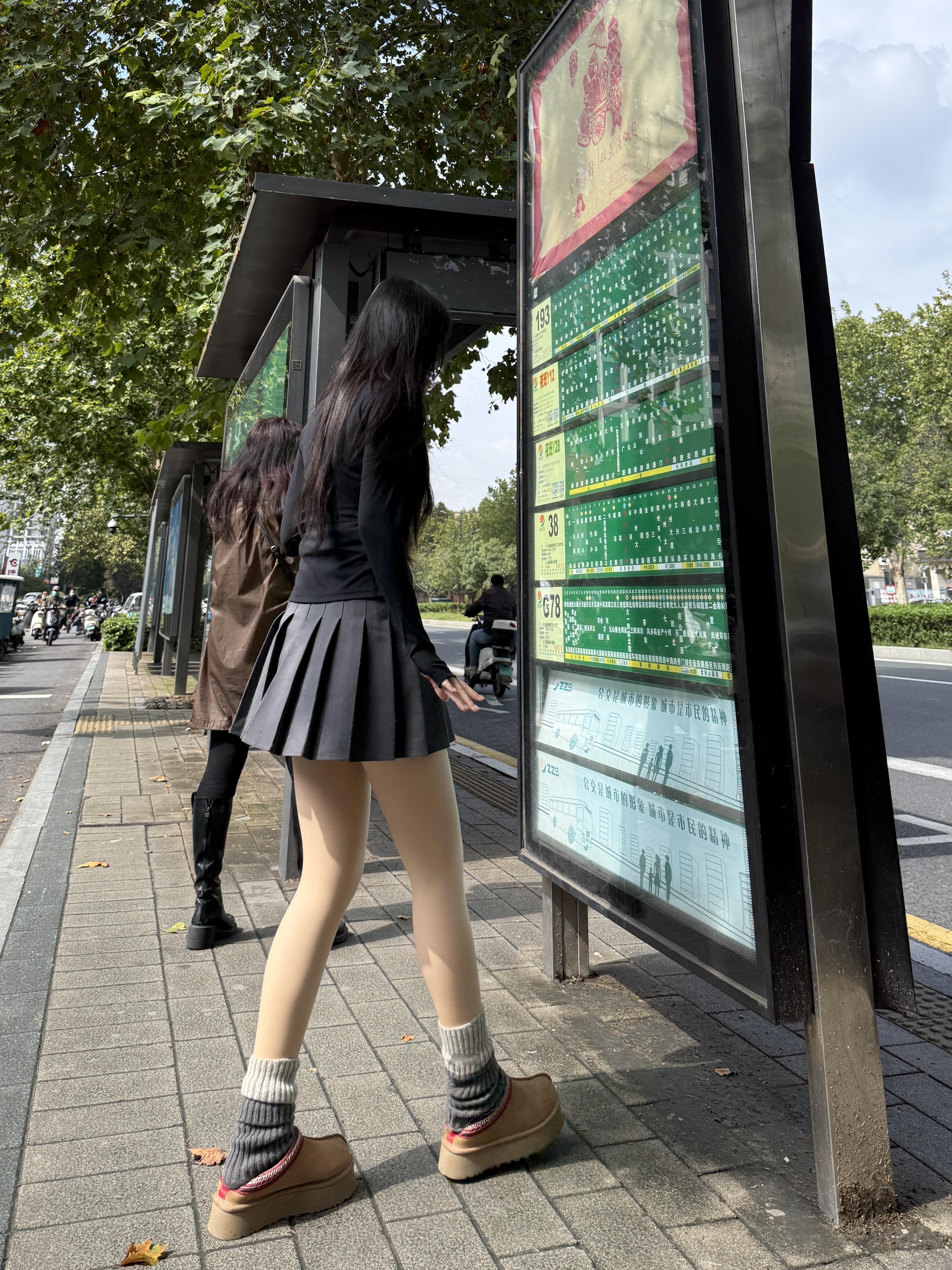 等车偶遇时尚小姐姐,这身搭配太可了! 黑色百褶裙+肉色丝袜+灰袜套,甜酷风拿捏得刚好,她在站牌前认真查路线,阳光下的侧影好治愈~猜猜她坐哪路车?有没有同款穿搭党来举手🙋