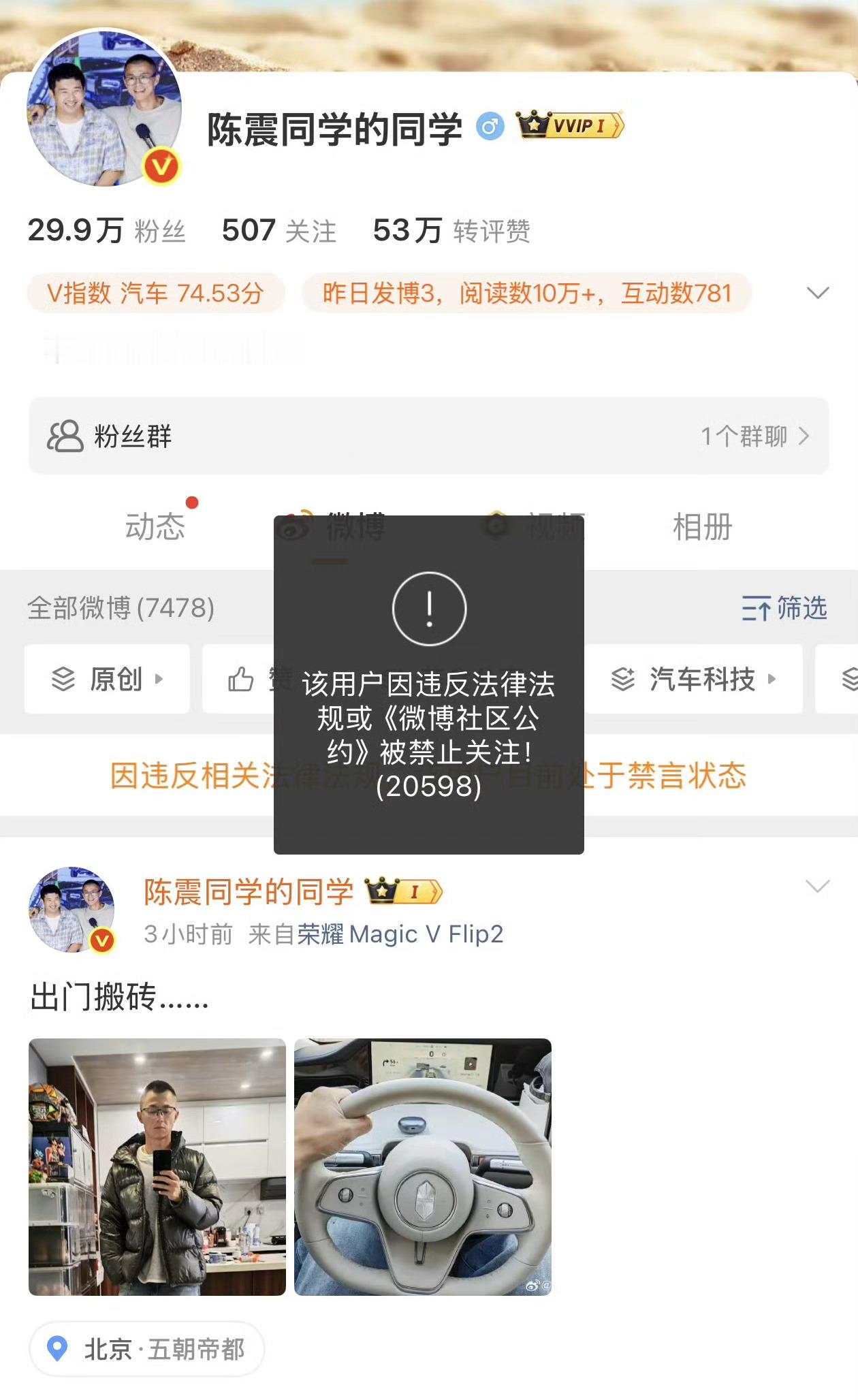 陈震同学的同学被禁言全平台连同小号也一起被处理了,这种力度其实已经说明问题的严重性