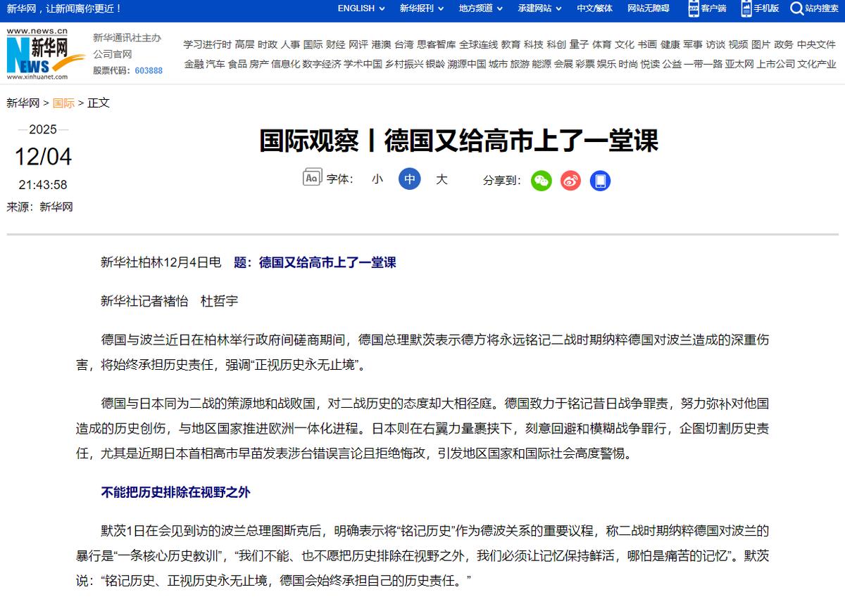 德国又给高市早苗上了一堂课! 据媒体12月4日报道:最近德国和波兰在柏林开会,德国总理默茨说,永远记得二战时纳粹德国害了波兰,这历史责任永远认,还强调“正视历史没有终点”。 这话不只是给受害国的承诺,更是给那些回避战争罪责的势力上了一课,日本首相高市早苗和她背后的右翼势力就该好好听听。 德国和日本都是二战战败国,可对历史的态度差得老远。德国一心记着自己的战争罪责,努力弥补伤害,还和周边国家一起推进欧洲一体化。 日本倒好,被右翼带着走,故意模糊战争罪行,想把责任推干净。尤其是高市早苗,最近说涉台的错话还不认错,让周边国家都很警惕。 说德国给她上课,一点都不冤,毕竟德国用几十年证明了,正视历史才能赢尊重,像她这样瞎掰历史、碰底线,最后只能被人骂。 这堂课的核心就是“真诚”,德国的忏悔可不是嘴上喊口号,全是实实在在的行动。 1970年联邦德国总理勃兰特访问波兰,在犹太人殉难纪念碑前直接跪下了,这一跪不是作秀,是认下国家的罪。 后来科尔总理也在以色列下跪道歉,一代代领导人把正视历史的态度传了下来。 不光领导人有态度,德国还把反思写进法律、融进教育。法律明确规定,宣传纳粹、否认大屠杀都要重罚。 教育上主动和法国、波兰合编历史课本,不藏着掖着,还让孩子调查二战受害犹太人的故事,从根上杜绝纳粹思想抬头。另外,德国还拿真金白银赔偿受害国家和人民,靠这份真诚赢得了全世界尊重。 可高市早苗偏要反着来,把德国的好例子当耳旁风。她作为日本首相,不仅不反思侵略罪行,还变本加厉:把“台湾有事”和日本安危绑在一起,违背国际法。 频繁参拜供奉着甲级战犯的靖国神社,还公然否认南京大屠杀、强征“慰安妇”的历史。 同样是战败国,德国靠正视历史发展得好,高市却带日本往右翼歪路上跑,让日本国际形象大跌,还破坏地区稳定。 其实高市真该好好学学德国,搞明白只有正视历史、承担责任,才能被世界接纳。 要是一直抱着错误史观不放,迟早让日本被全世界孤立,付出惨痛代价。这堂课,她必须好好听进去。