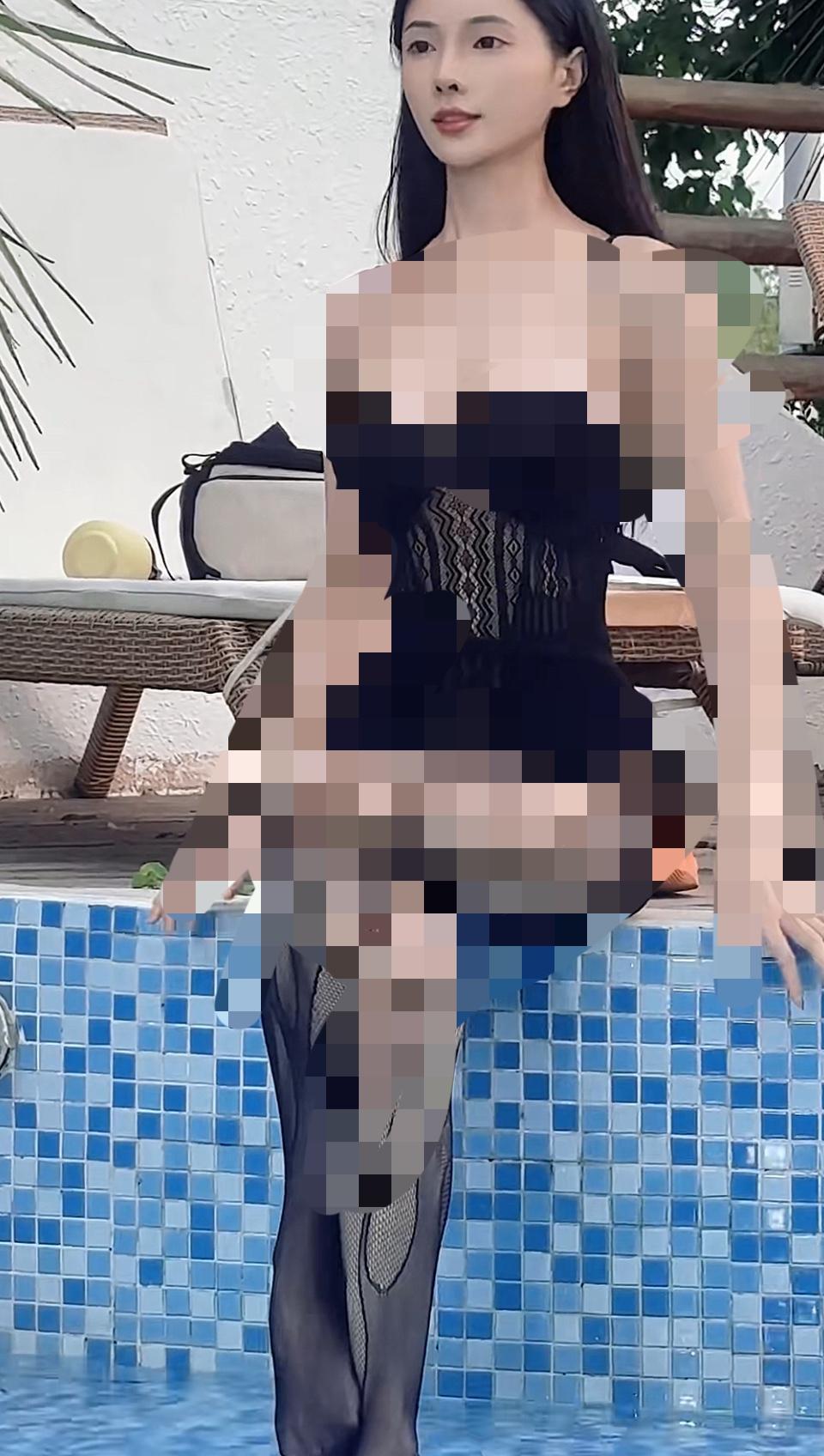 夏日泳池边,黑裙与网袜的完美搭配,尽显优雅与性感。黑裙丝袜写真 波点黑色袜穿搭