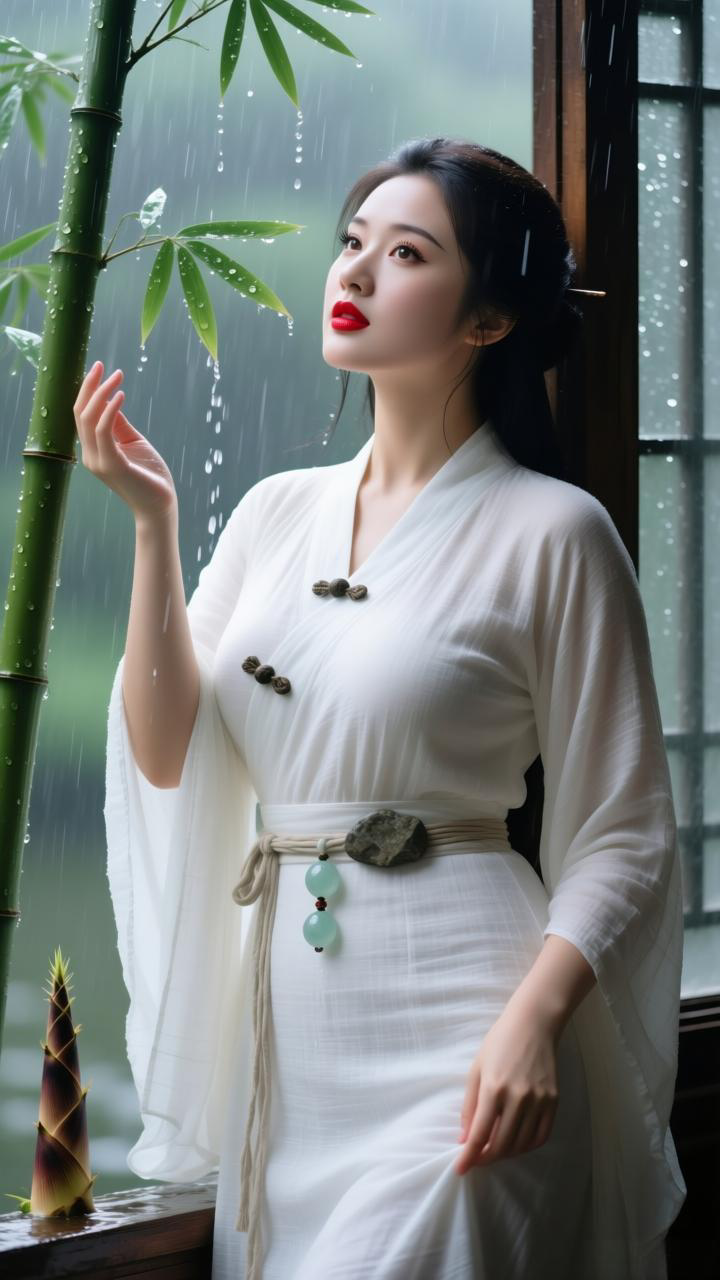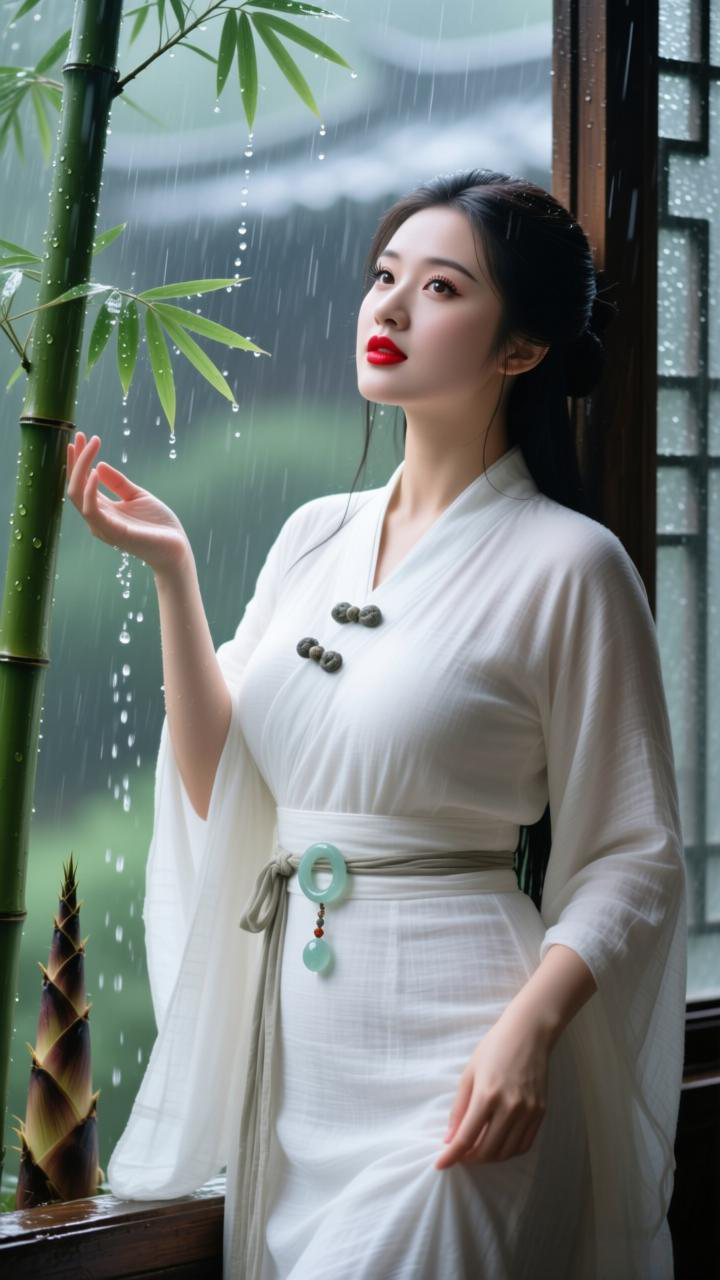 18岁少女,雨织窗畔修竹,素衣女子抬腕轻接叶间垂落的雨珠,眉梢眼角浸着...