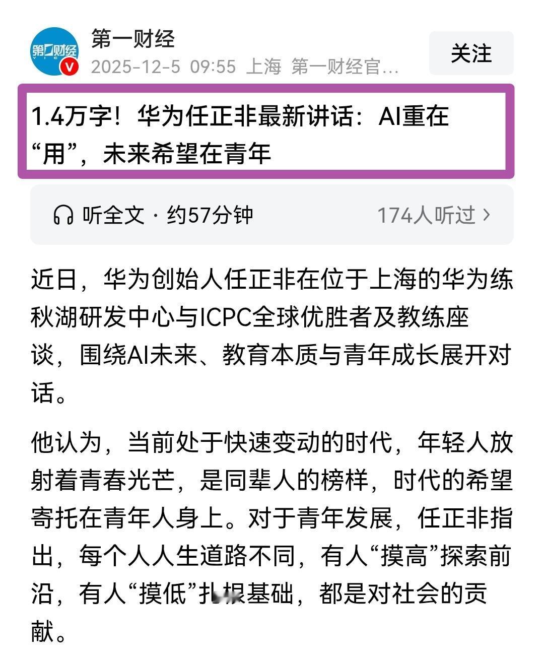 任正非这场和ICPC青年才俊的座谈,通篇没讲什么宏大的技术噱头,反而透出一股反内卷的清醒,这场讲话就务实二字,AI不追风口追场景,算力不搞泡沫搞匹配,人才不逼成功逼成长。这种清醒,在当下浮躁的科技圈里,反而比任何技术蓝图都更有价值。毕竟科技最终的意义,从来不是造出多牛的技术,而是解决多少实实在在的问题。 华为要的是把大模型塞进高炉、矿山、医院,让技术变成实打实的生产力,而不是停留在实验室的论文里。更有意思的是他给不同国家的AI路线划了重点,印尼不用搞大模型,先把港口自动化做好。中国要盯着高铁调度、水泥无人化这些刚需,这种因地制宜的思路,比喊AI强国的口号靠谱多了。毕竟不是所有国家都有能力烧钱搞基础研发,把现有技术用到位,才是对国家最实在的贡献。 最让人有感触的,还是他对年轻人的反成功学寄语,有能力的就去攀科研的喜马拉雅,哪怕最后没登顶,沿途的积累也能转化成产业价值。想扎根基础的也值得尊重,不是所有人都要去搞前沿创新。这种包容的人才观,比喊重视年轻人的口号管用。毕竟科技的进步,既需要仰望星空的探索者,也需要脚踏实地的实践者。 他强调华为是技术公司,不是科学公司。现在很多校企合作搞成了企业替高校搞科研,高校替企业卖产品,两边都不专业。任正非的这个定位,其实是在给行业立规矩。各司其职、各做擅长的事,才能形成产学研的良性循环,而不是互相越界、内耗严重。 任正非思维 华为AI技术