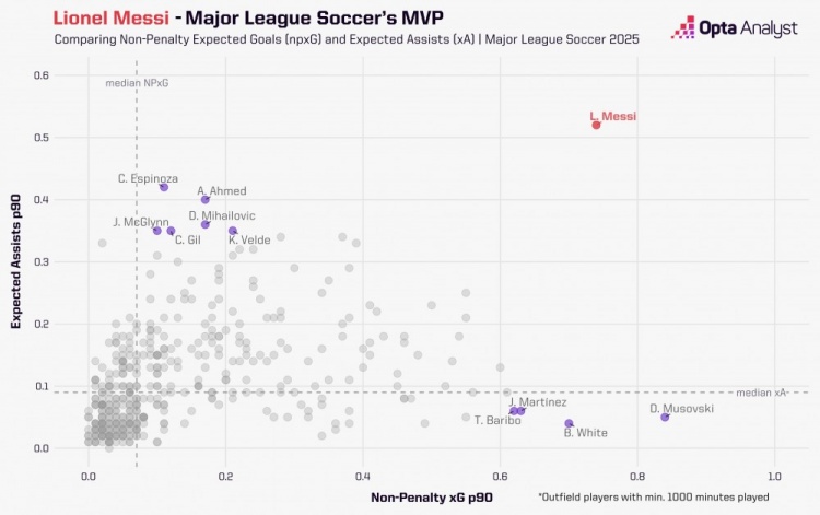统计显示,梅西在2025赛季美职联的场均非点球预期进球数超过0.5球,排名第一,远超其他出场至少1000分钟的非门将球员。