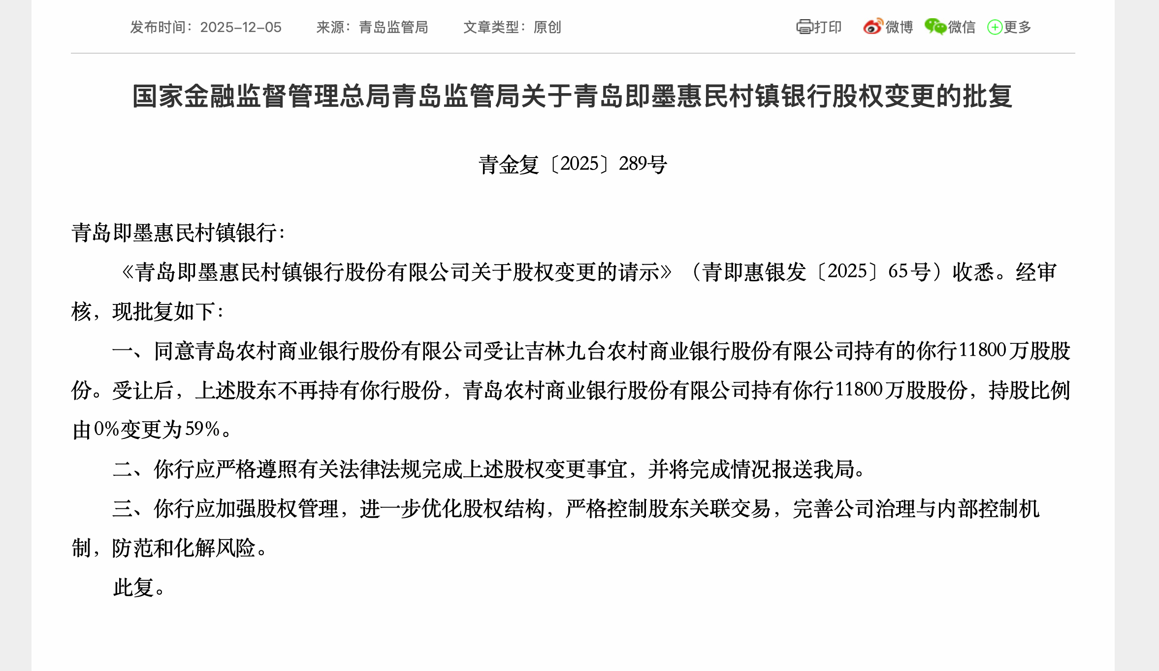 上证报中国证券网讯(记者徐潇潇)12月5日,记者获悉,国家金融监督管理总局青岛监管局批复了《青岛即墨惠民村镇银行股份有限公司关于股权变更的请示》,同意青岛农村商业银行股份有限公司受让吉林九台农村商业银行股份有限公司持有的该行11800万股股份。受让后,上述股东不再持有该行股份,青岛农村商业银行股份有限公司持有该行11800万股股份,持股比例由0%变更为59%。